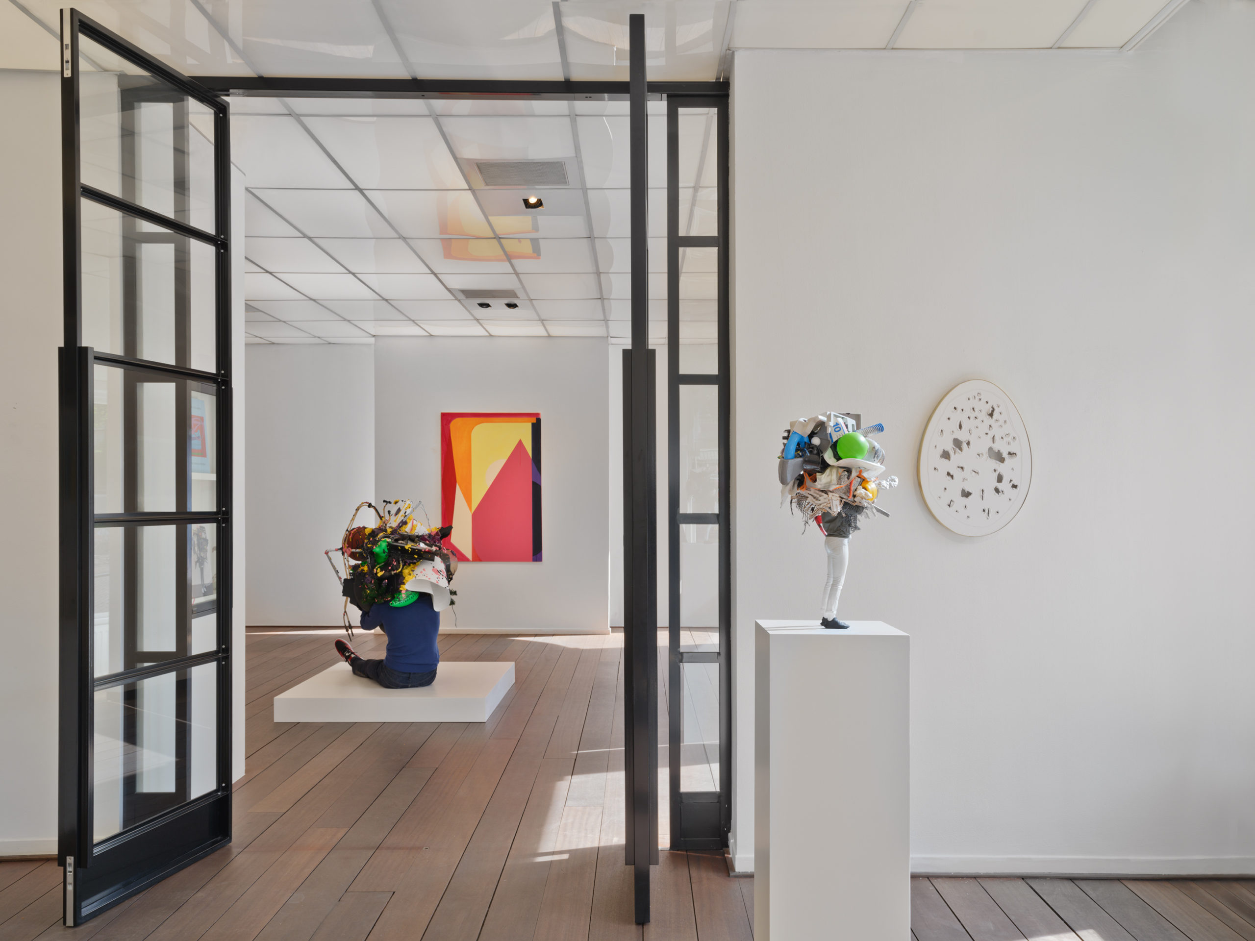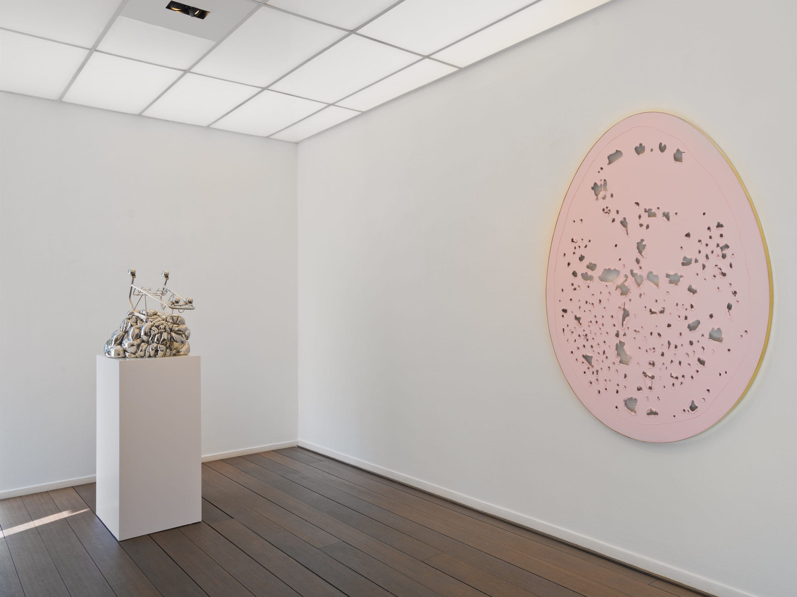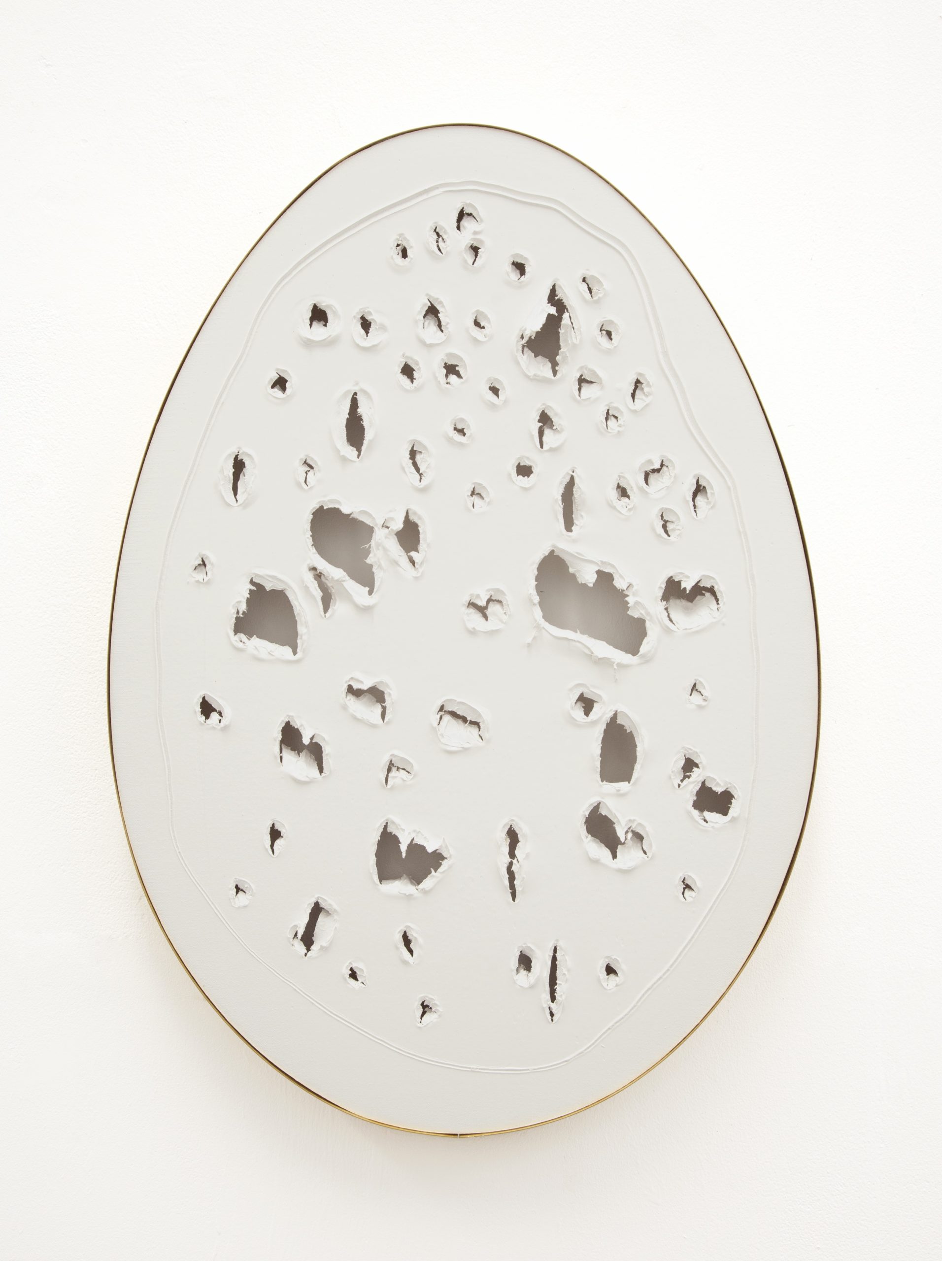 Yet, the artists’ works are also abstract when approaching the theme of fragmentation. Gavin Turk playfully stabs his initials into egg paintings, dramatically perforating them with his artist signature. A reference to Lucio Fontana's 'Fine de Dio' (the End of God), this painting gestures at larger discussions of authorship and iconography. Through geometric and organic shapes, Anna Liber Lewis orchestrates a narrative of the conflict and harmony an artist encounters when composing a painting. Triangular shape meets circle meets curve; contrasting colour fields rub shoulders on her canvasses. The fragments are the building blocks of their works created through vandalism, signatures, and brushstrokes. They do not naively approach the world as a united whole but showcase it as beautiful explosion of splinters twirling through the air.