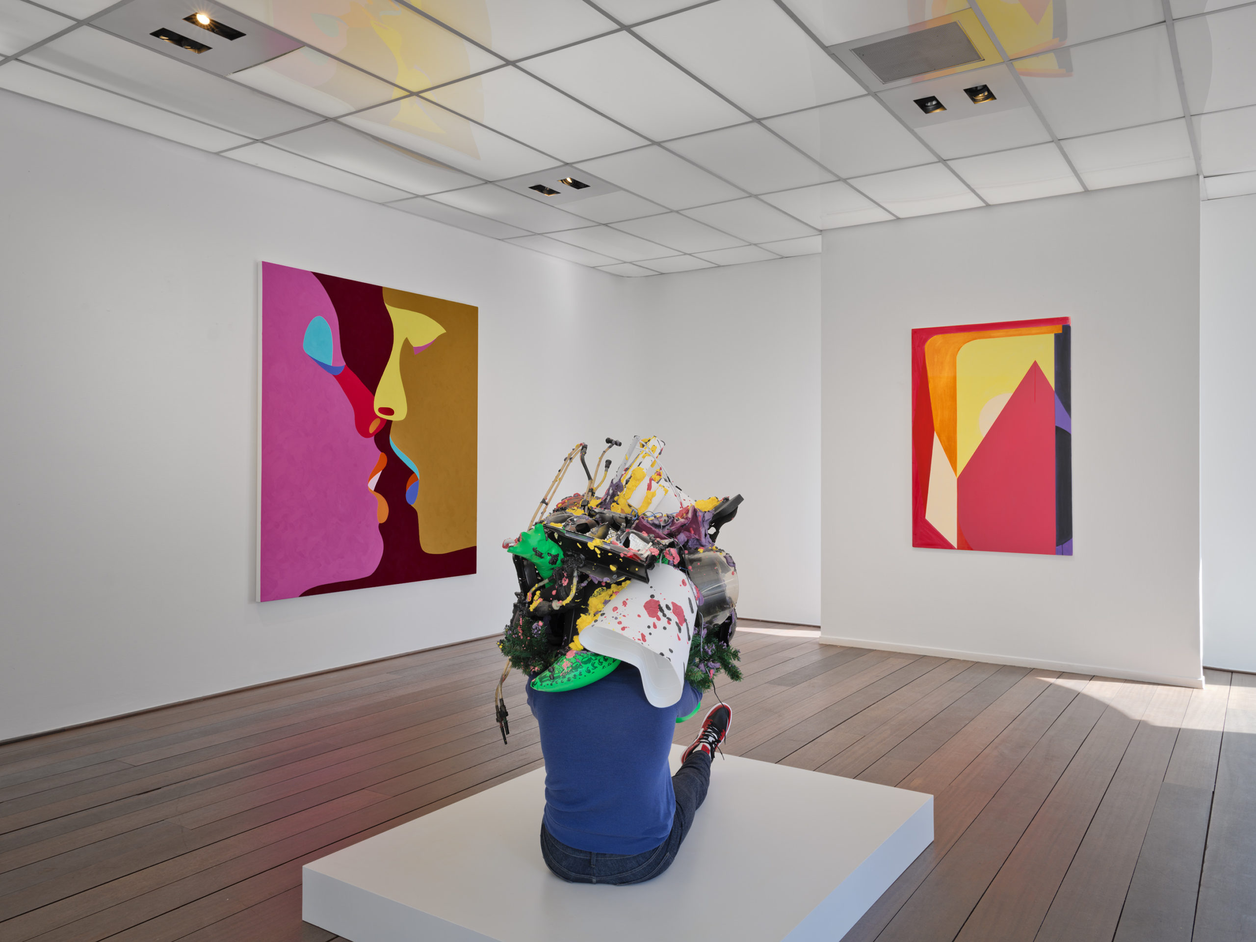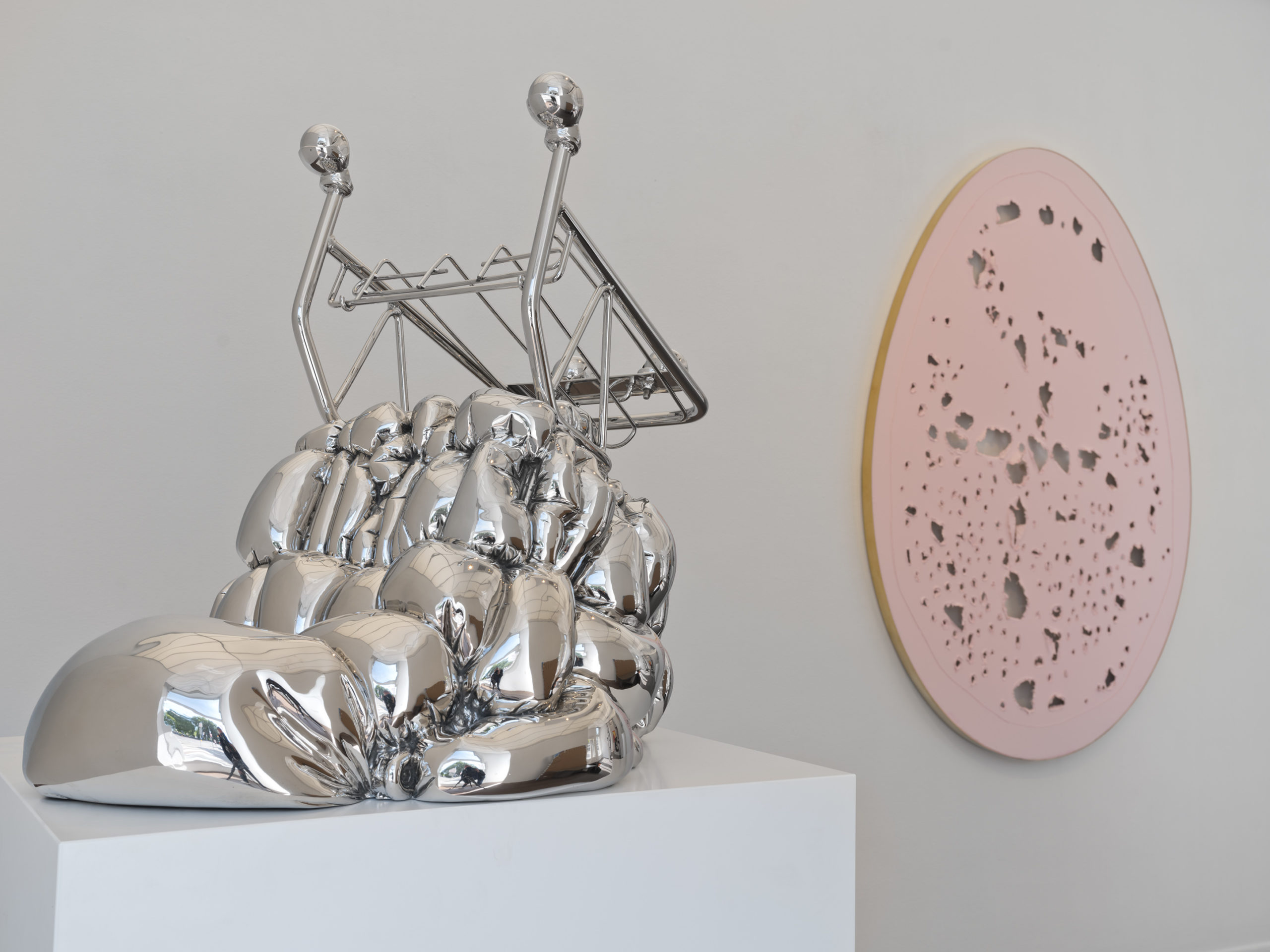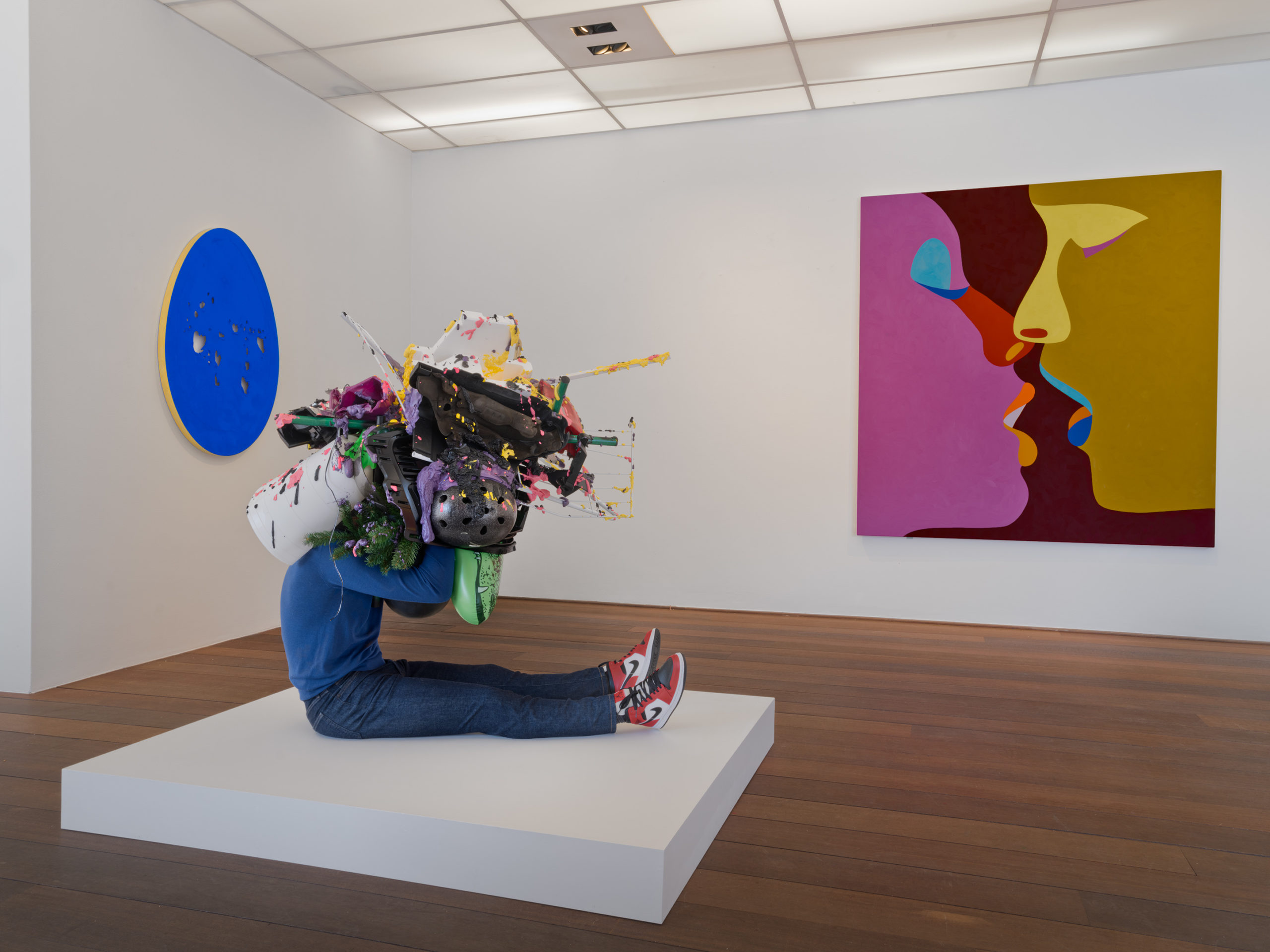 Fragmentation is a working method of each of the artists Reflex invited; they are deeply engaged with the world and visualizing its shards. Daniel Firman conjures up wild sculptures examining human existence as a magnetic force attracting objects, little items stick to a person’s head as a lifesize sculpture of the flux of information we exist in every day. Also fascinated with this, Michael Craig-Martin on highlights items as exhilarating icons of mundanity as he zooms in on bowling balls, phones, and laptops. The artists’ works mirrors and expand one another’s interpretation. Keith Coventry proffers an insight into the recognizability of signs as he showcases parts of the McDonald’s M in his Junk paintings.
