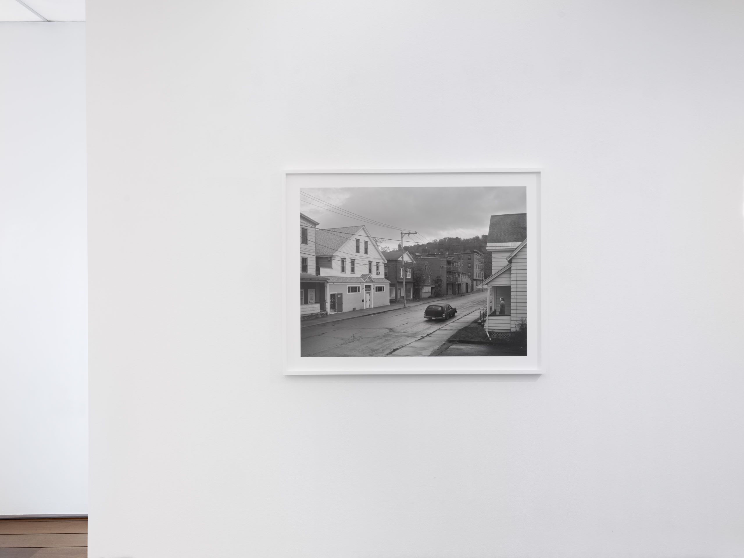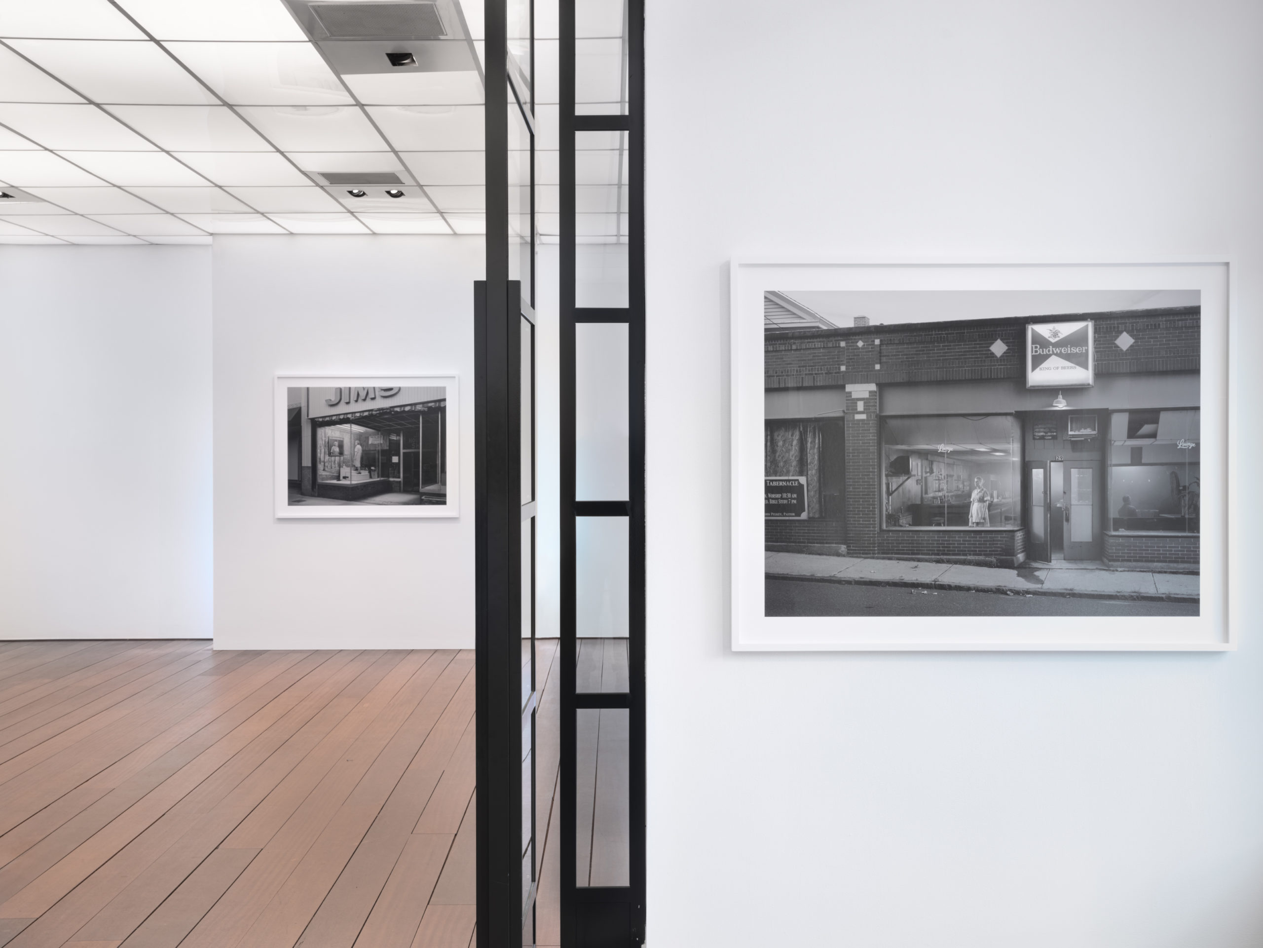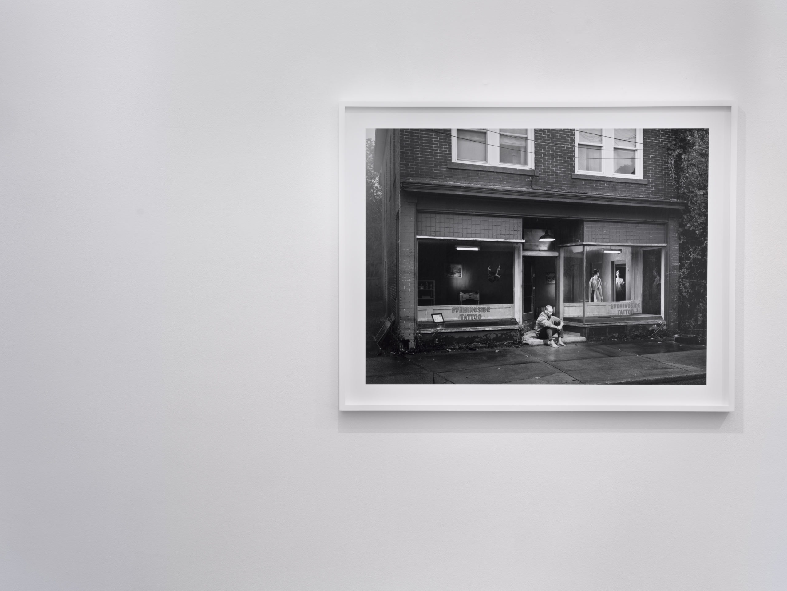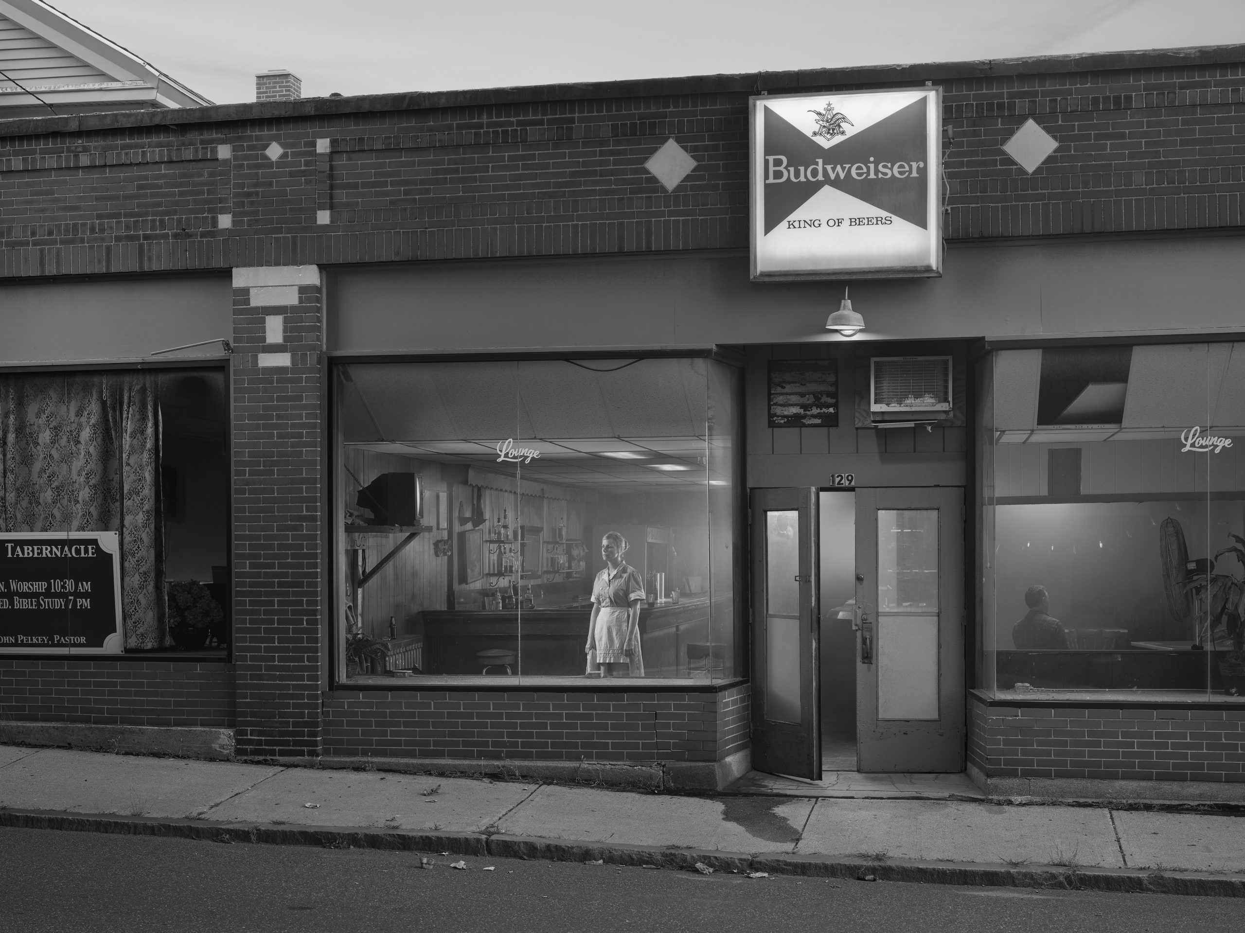 In Eveningside (2021-2022), Crewdson explores moments of contemplation within the confines of quotidien life, in places of employment, and in moments just outside of those work structures. The figures populating the pictures are sparse, and are often seen through storefront windows, in mirror reflections, or positioned underneath the mundane proscenium found in the midst of their everyday routines: railroad bridges, doorways, porches, the overhanging roofline of a bank teller drive-through, a dairy bar, a corner market, or a hardware store. Bringing his vantage point closer to the figures, using a heightened range of light and darkness, special effects such as fog, rain, smoke, and haze, and for the first time using his now ubiquitous full production and lighting team in a monochromatic palette, the result is a rich gothic atmosphere, evocative of film noir and classic cinema, but with the capabilities and clarity of the most current technology available in digital photography. Eveningside comprises 20 digital pigment prints, 87.6 x 116.8 cm. (34.5 x 46 in.)