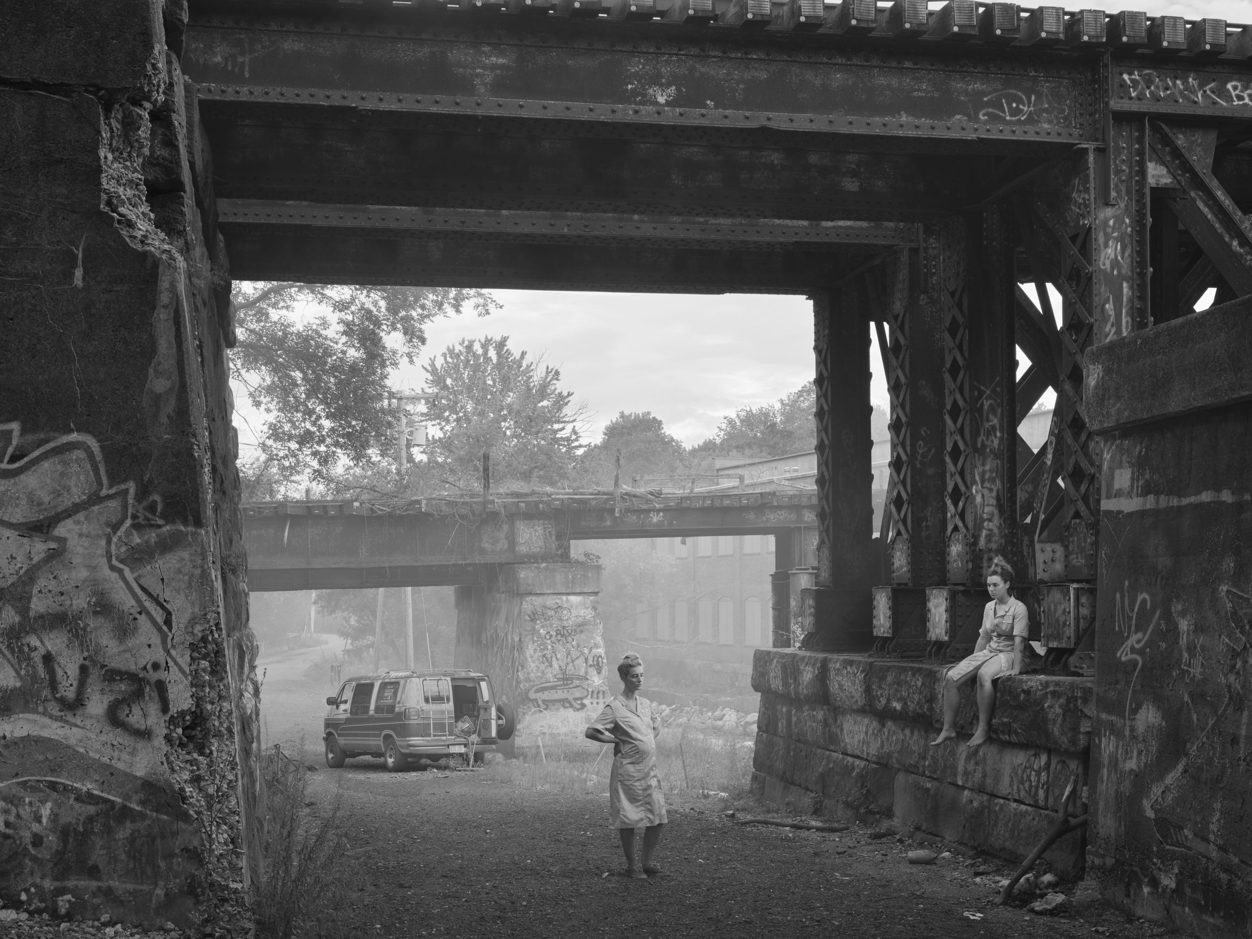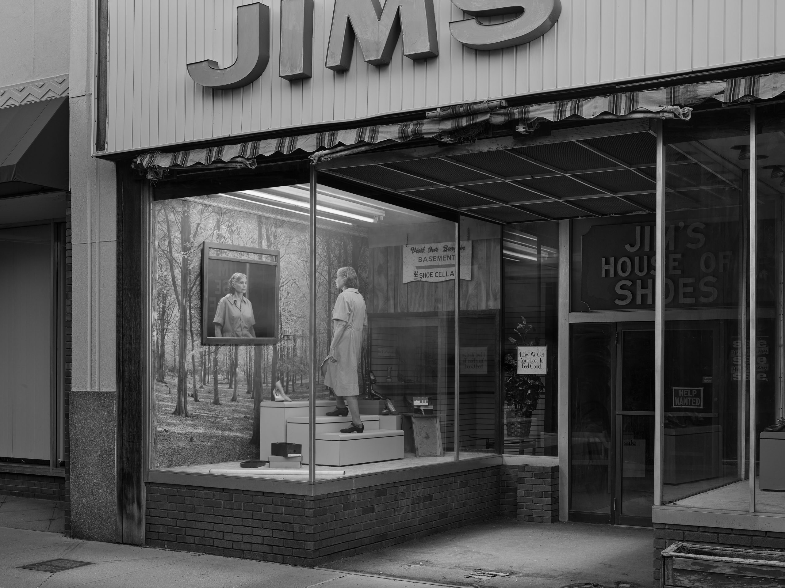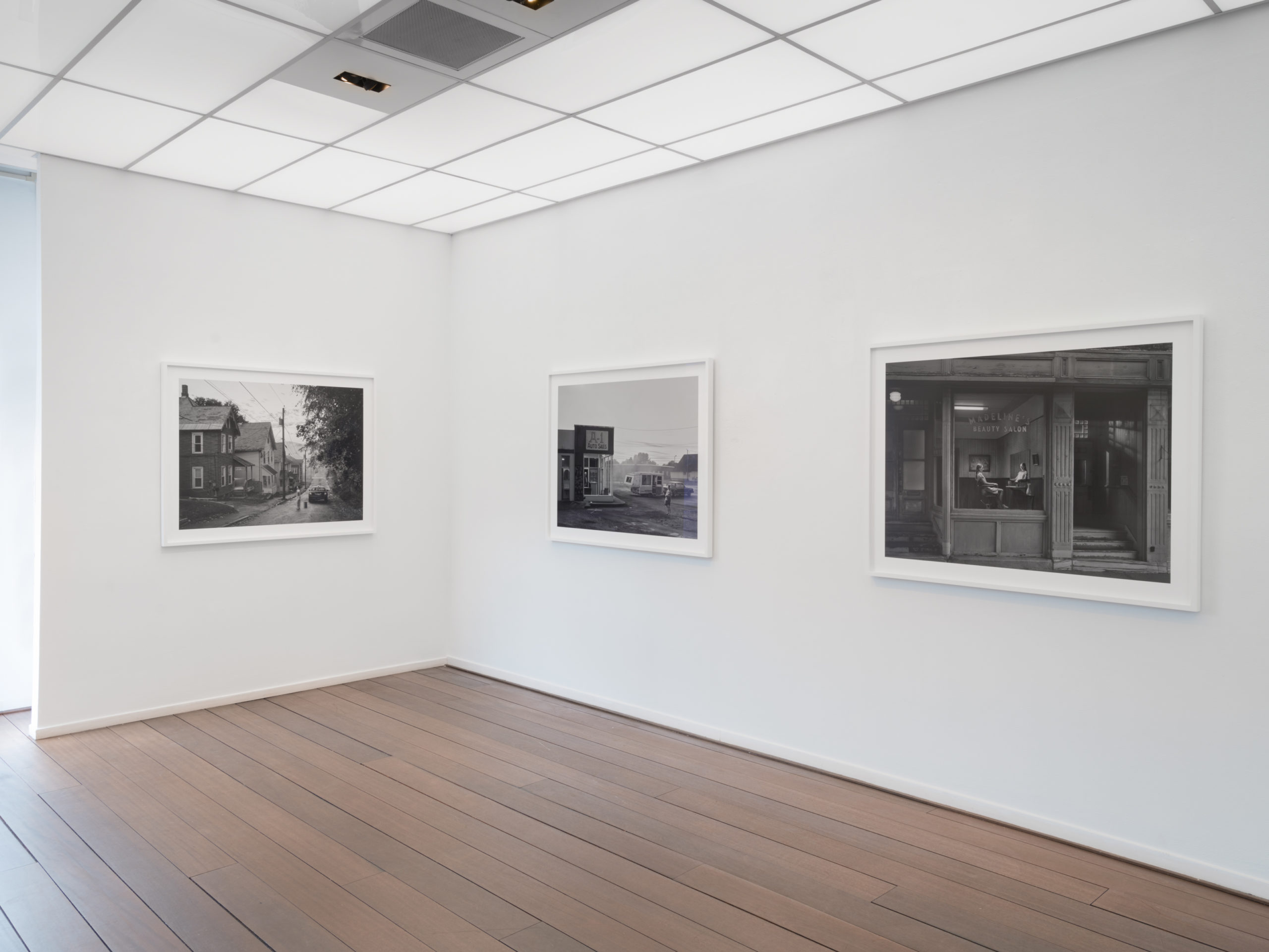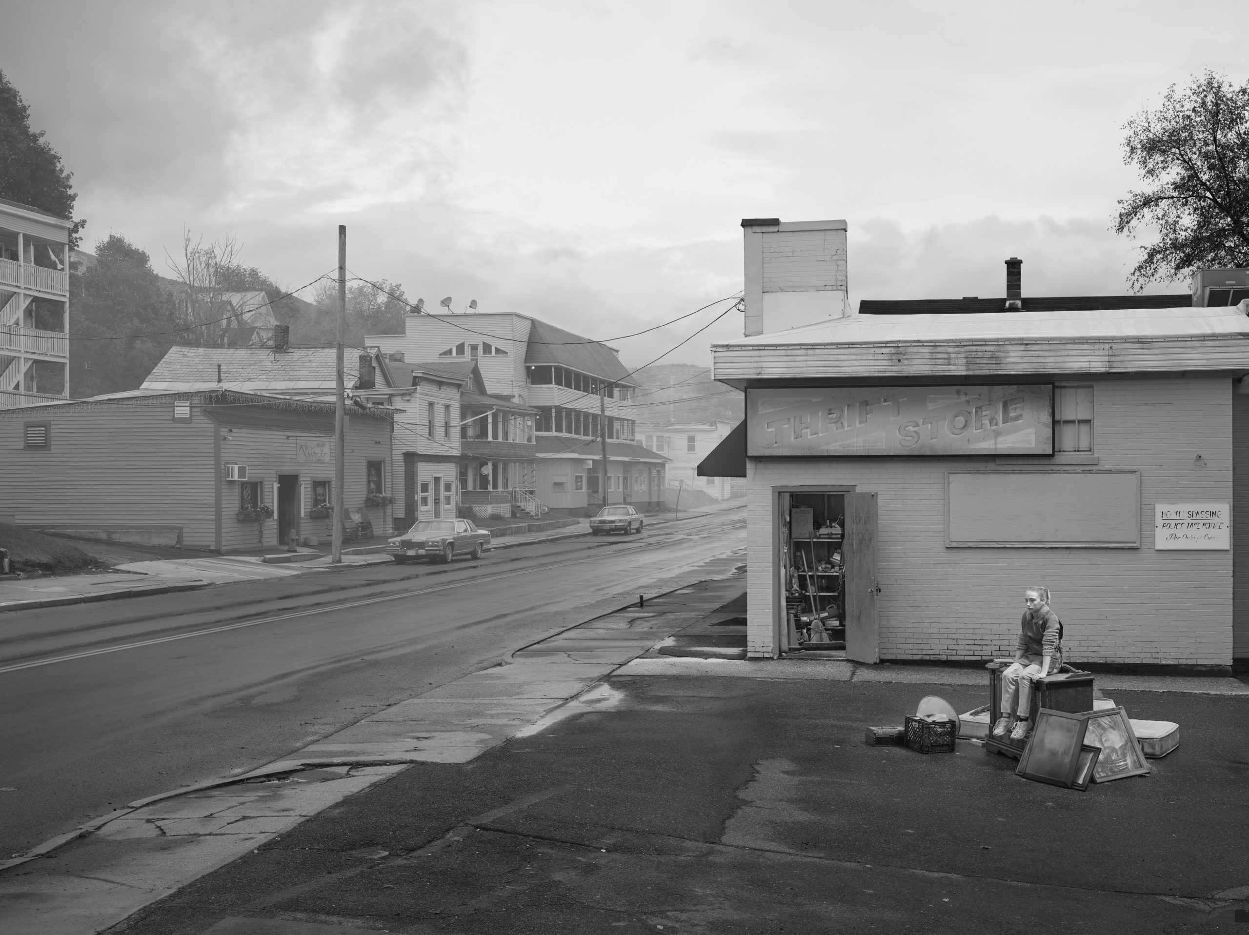 In Eveningside (2021-2022), Crewdson explores moments of contemplation within the confines of quotidien life, in places of employment, and in moments just outside of those work structures. The figures populating the pictures are sparse, and are often seen through storefront windows, in mirror reflections, or positioned underneath the mundane proscenium found in the midst of their everyday routines: railroad bridges, doorways, porches, the overhanging roofline of a bank teller drive-through, a dairy bar, a corner market, or a hardware store. Bringing his vantage point closer to the figures, using a heightened range of light and darkness, special effects such as fog, rain, smoke, and haze, and for the first time using his now ubiquitous full production and lighting team in a monochromatic palette, the result is a rich gothic atmosphere, evocative of film noir and classic cinema, but with the capabilities and clarity of the most current technology available in digital photography. Eveningside comprises 20 digital pigment prints, 87.6 x 116.8 cm. (34.5 x 46 in.)
