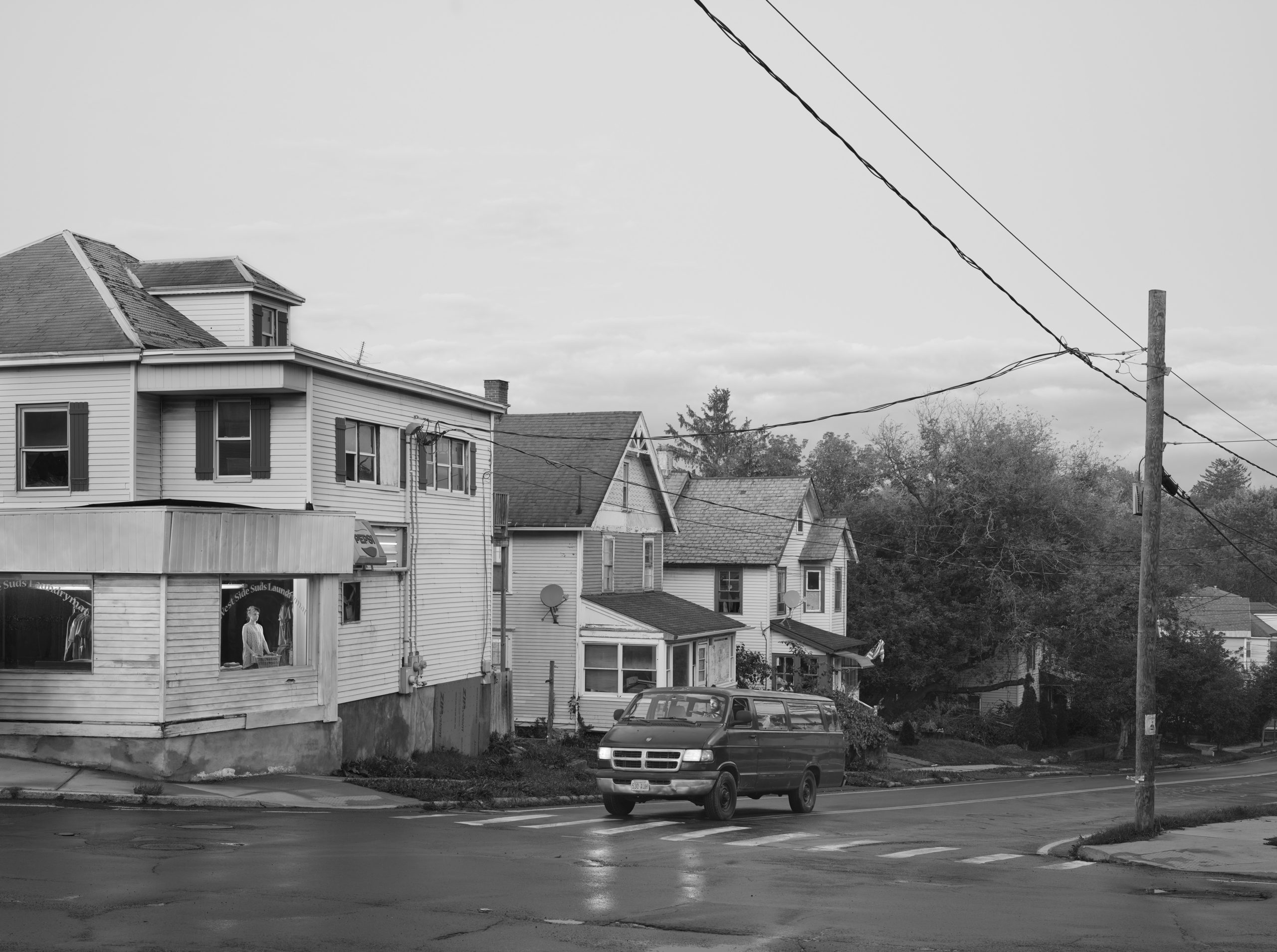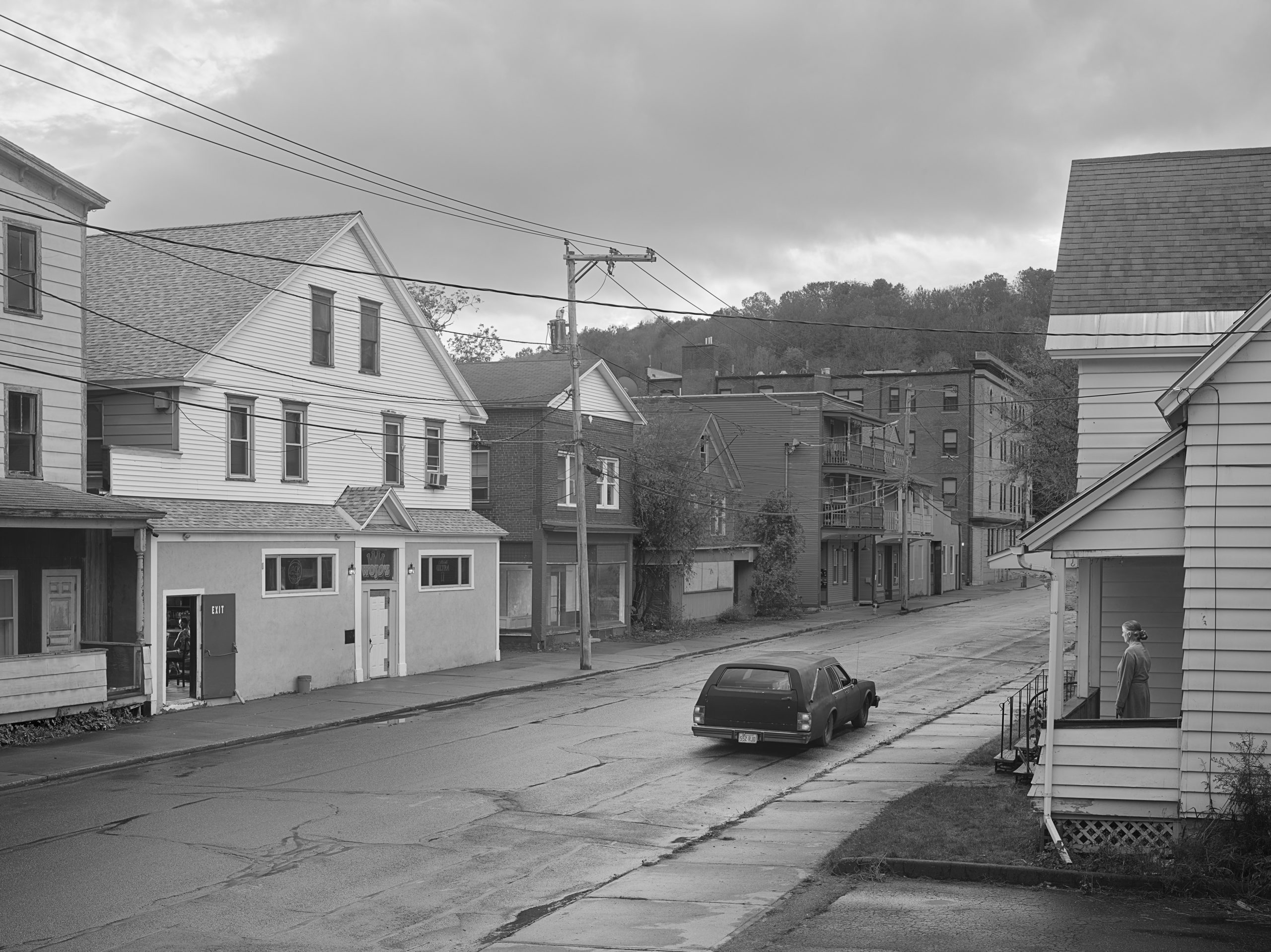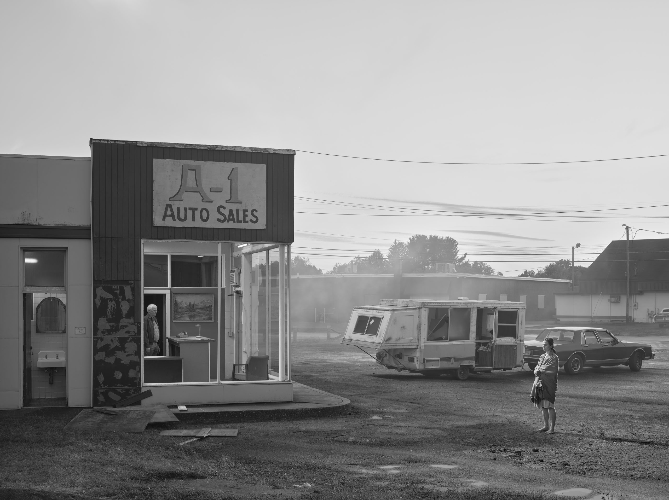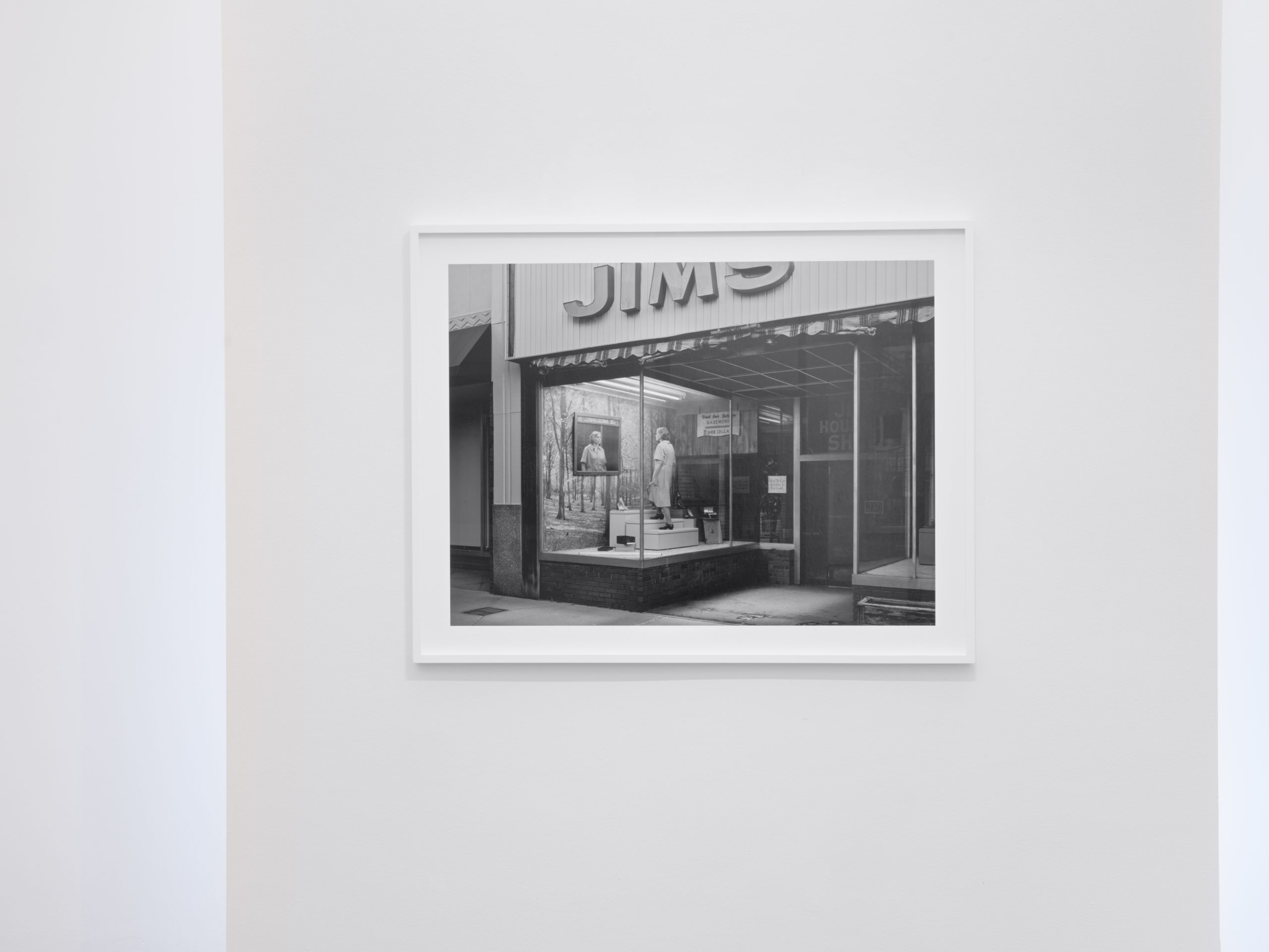 In Eveningside (2021-2022), Crewdson explores moments of contemplation within the confines of quotidien life, in places of employment, and in moments just outside of those work structures. The figures populating the pictures are sparse, and are often seen through storefront windows, in mirror reflections, or positioned underneath the mundane proscenium found in the midst of their everyday routines: railroad bridges, doorways, porches, the overhanging roofline of a bank teller drive-through, a dairy bar, a corner market, or a hardware store. Bringing his vantage point closer to the figures, using a heightened range of light and darkness, special effects such as fog, rain, smoke, and haze, and for the first time using his now ubiquitous full production and lighting team in a monochromatic palette, the result is a rich gothic atmosphere, evocative of film noir and classic cinema, but with the capabilities and clarity of the most current technology available in digital photography. Eveningside comprises 20 digital pigment prints, 87.6 x 116.8 cm. (34.5 x 46 in.)