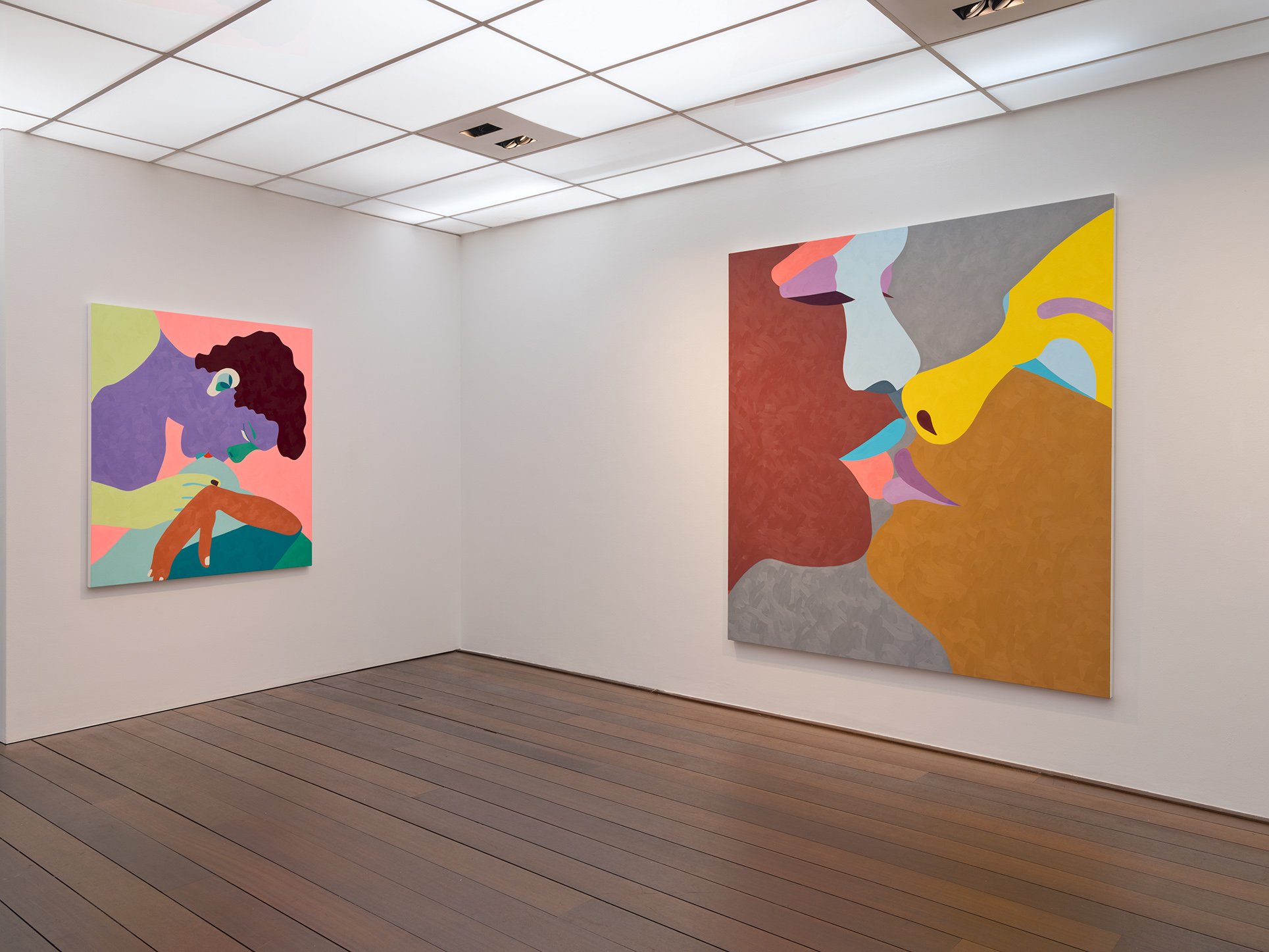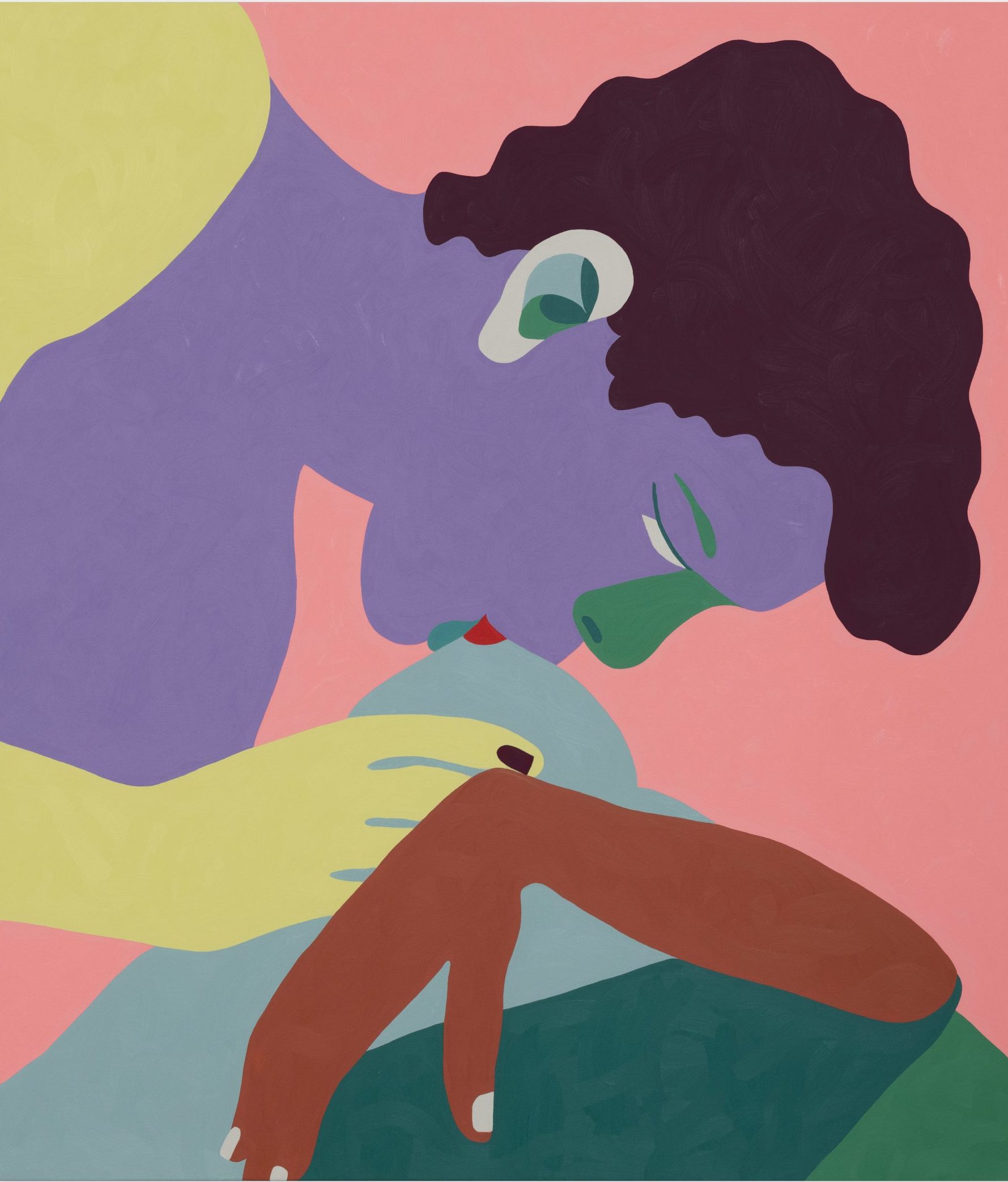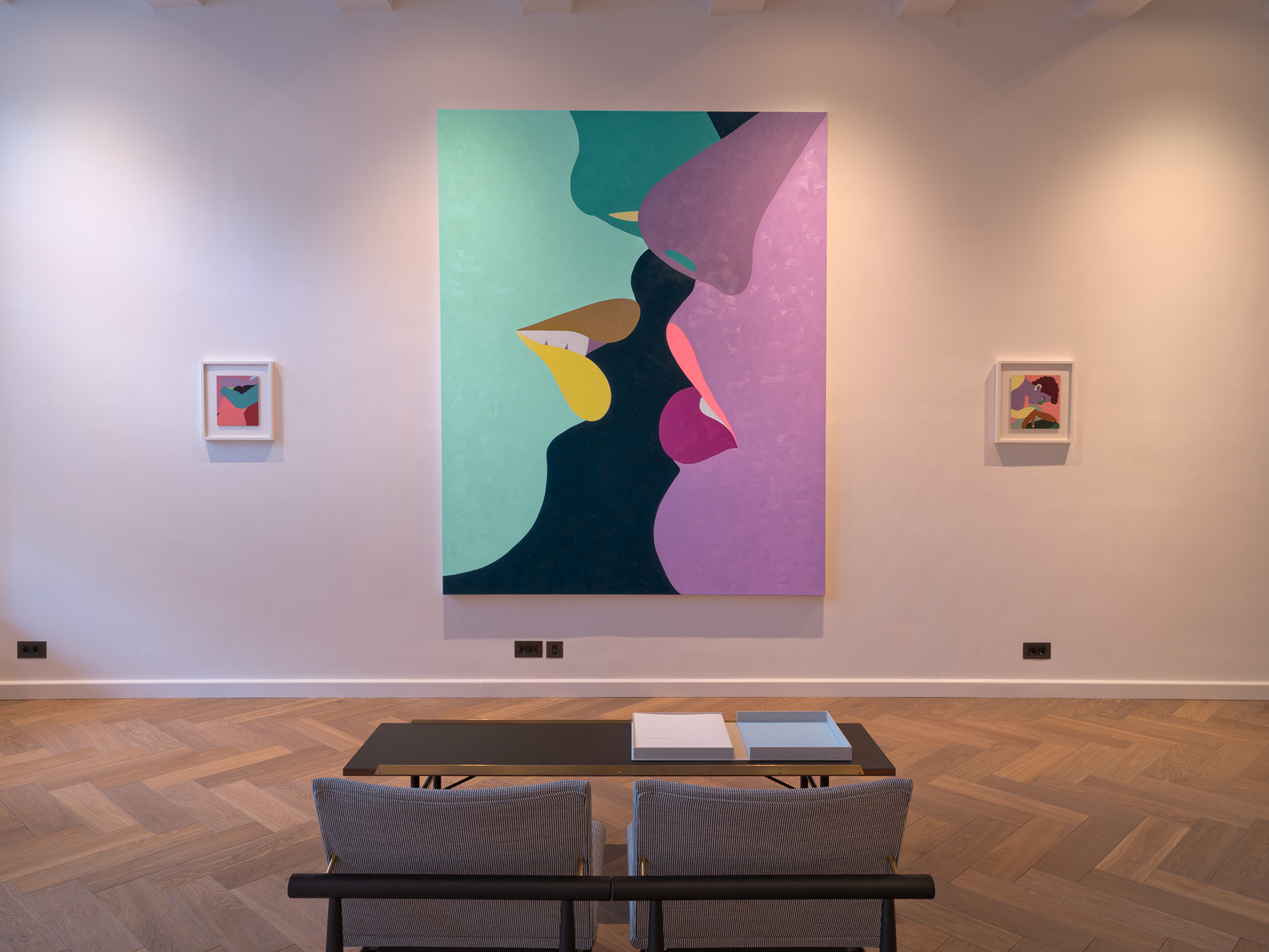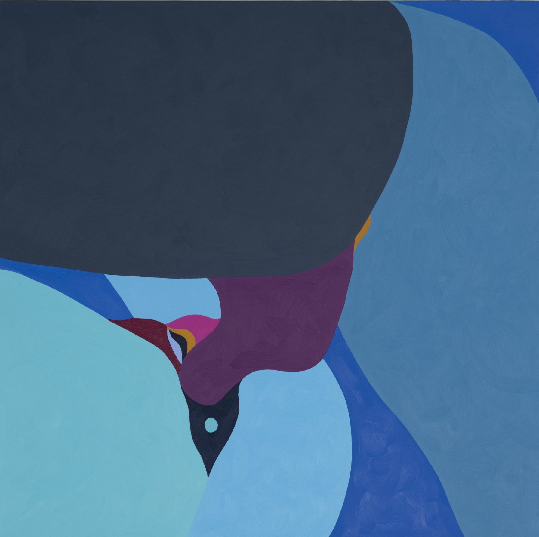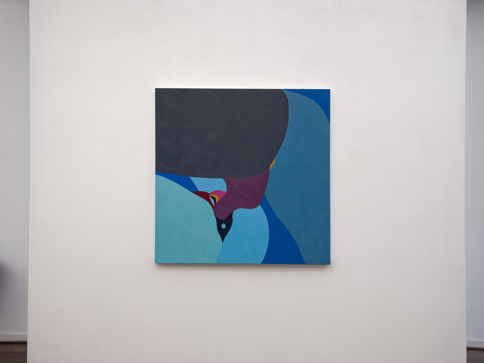 Inspired by Pablo Picasso’s blue period, the artist introduces the colour in a patchwork of tones to divide the space of the paintings. In Lipsing (2022), two profiles collide at the nose in a composition of navy and turquoise, contrasted by a bold yellow. In another work, Though Lovers Be Lost, Love Shall Not (2022) the multiple shades of blue demand the audience to stay with the work longer to comprehend the content. Though inspired by Picasso’s undeniable melancholy, Beard remains devoted to electrifying notions of yearning and desire and the beautifully orchestrated monochromatic topographies indicate a heightened sensibility in the new works.