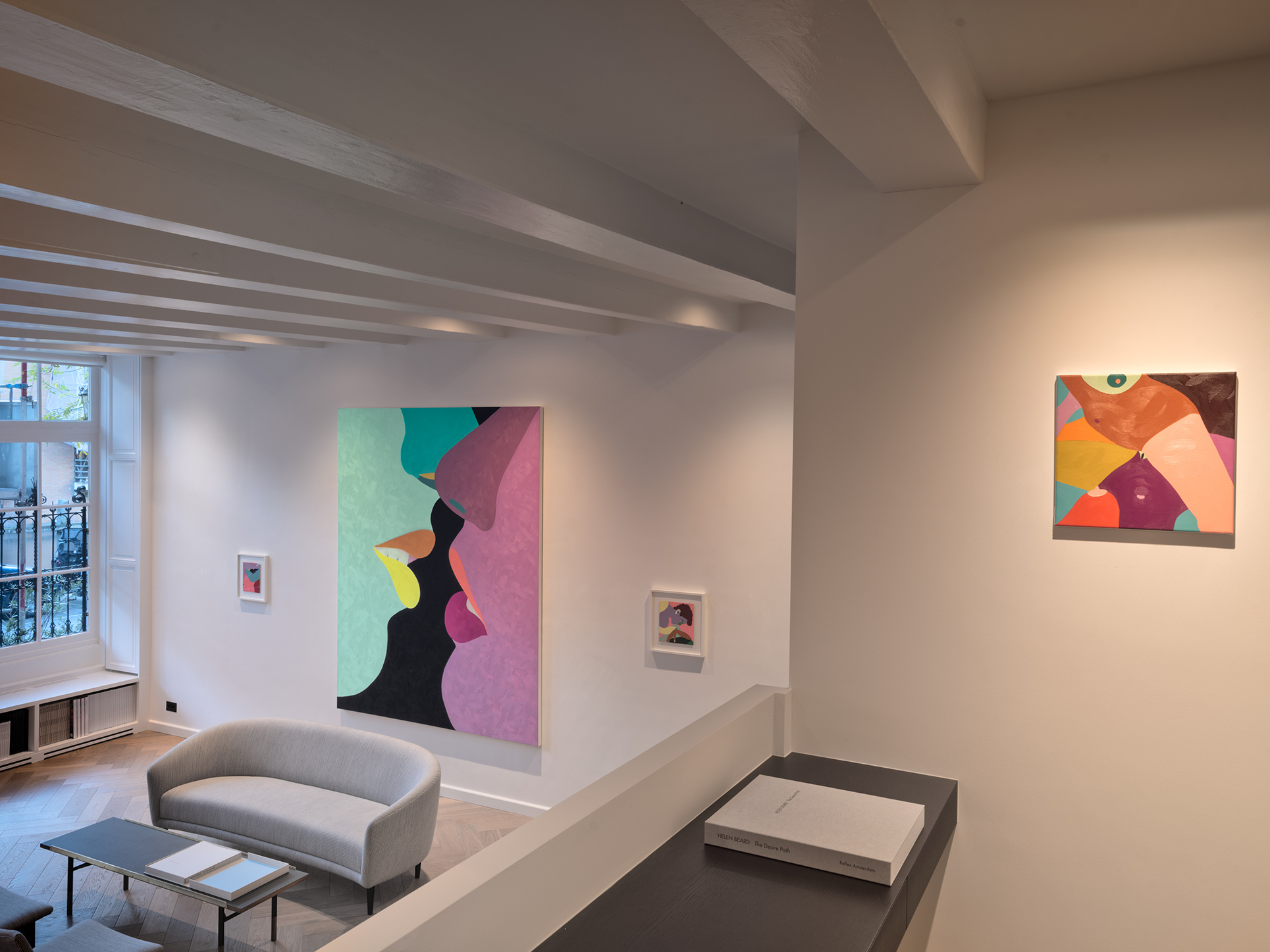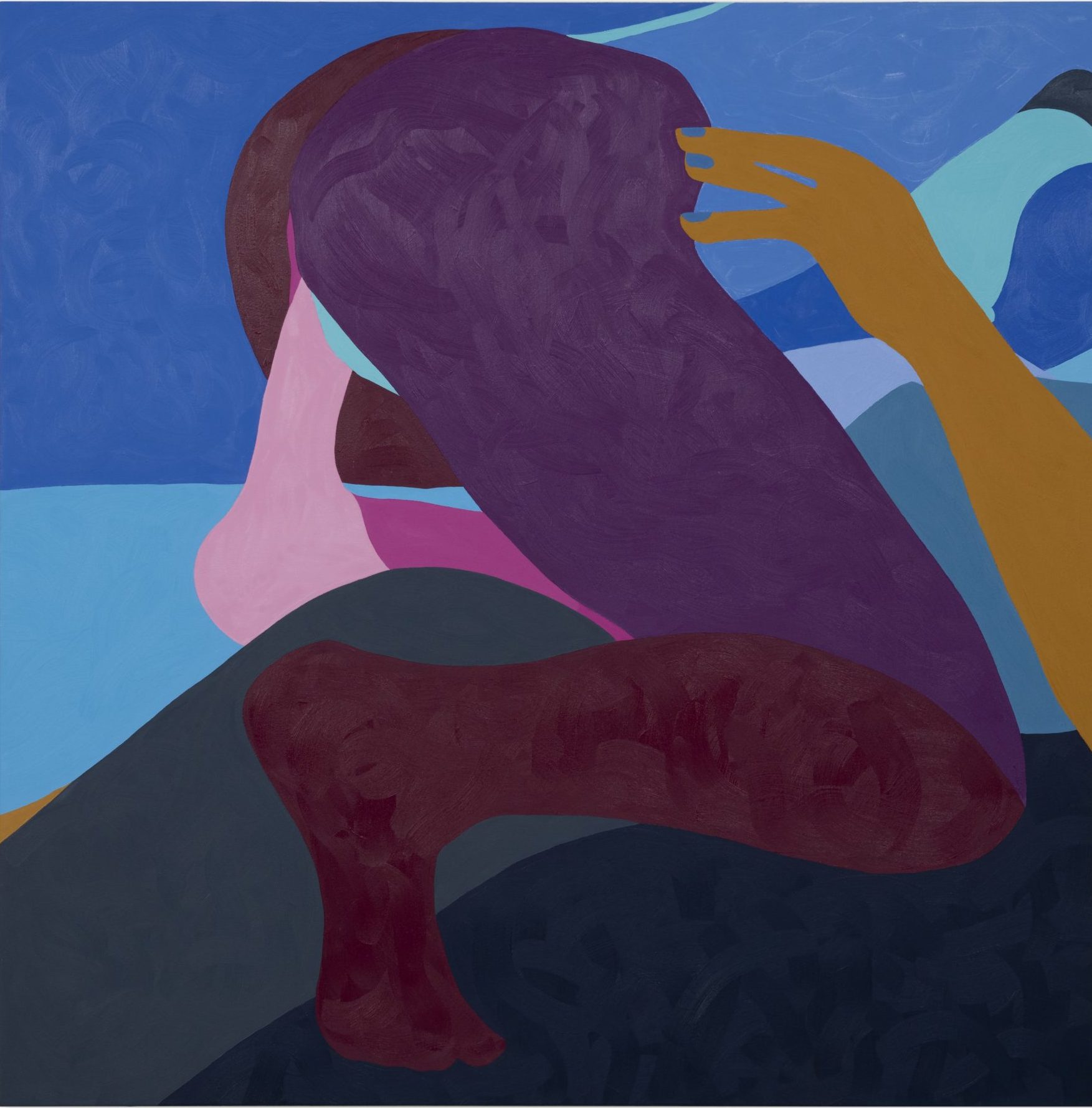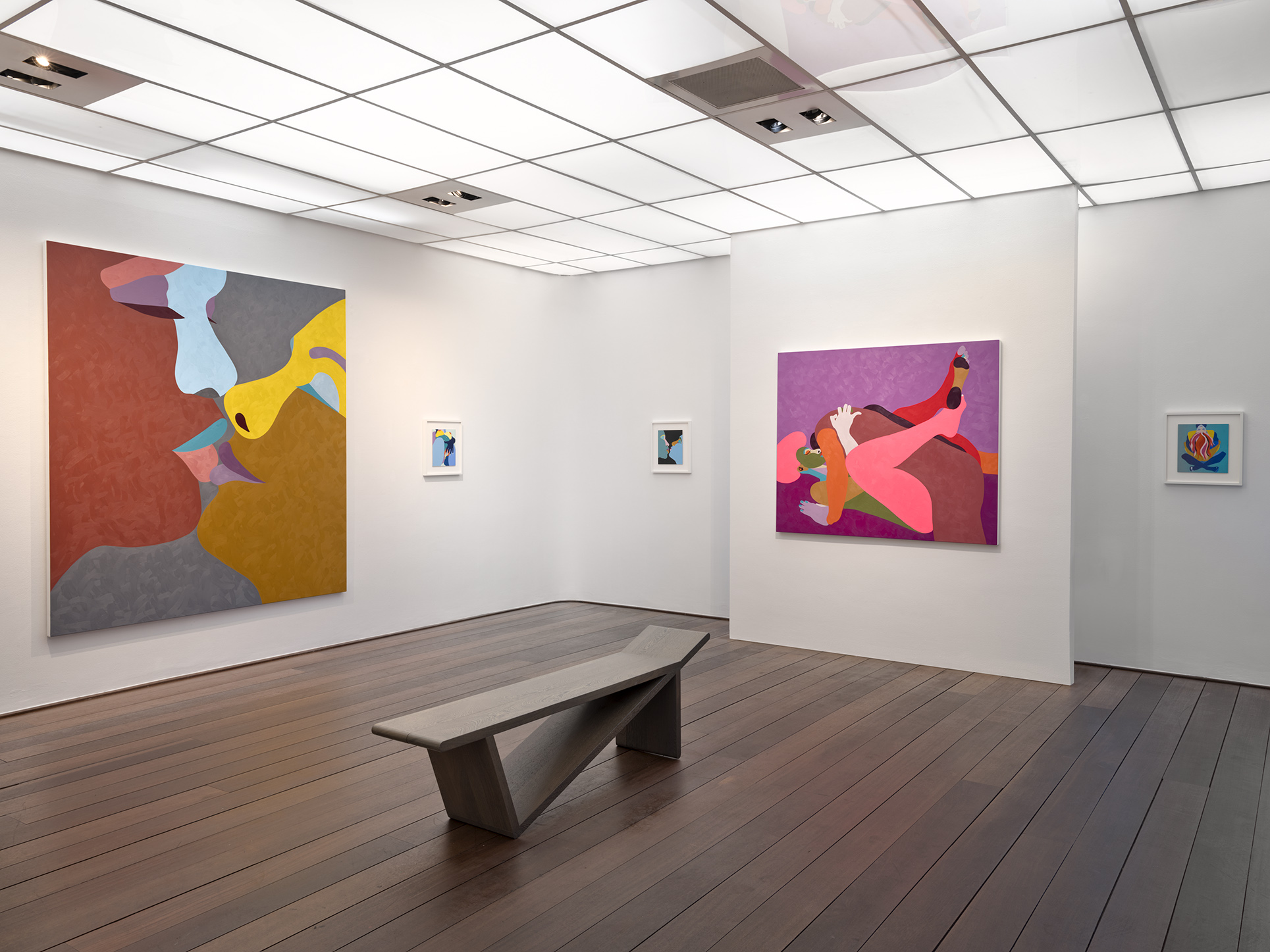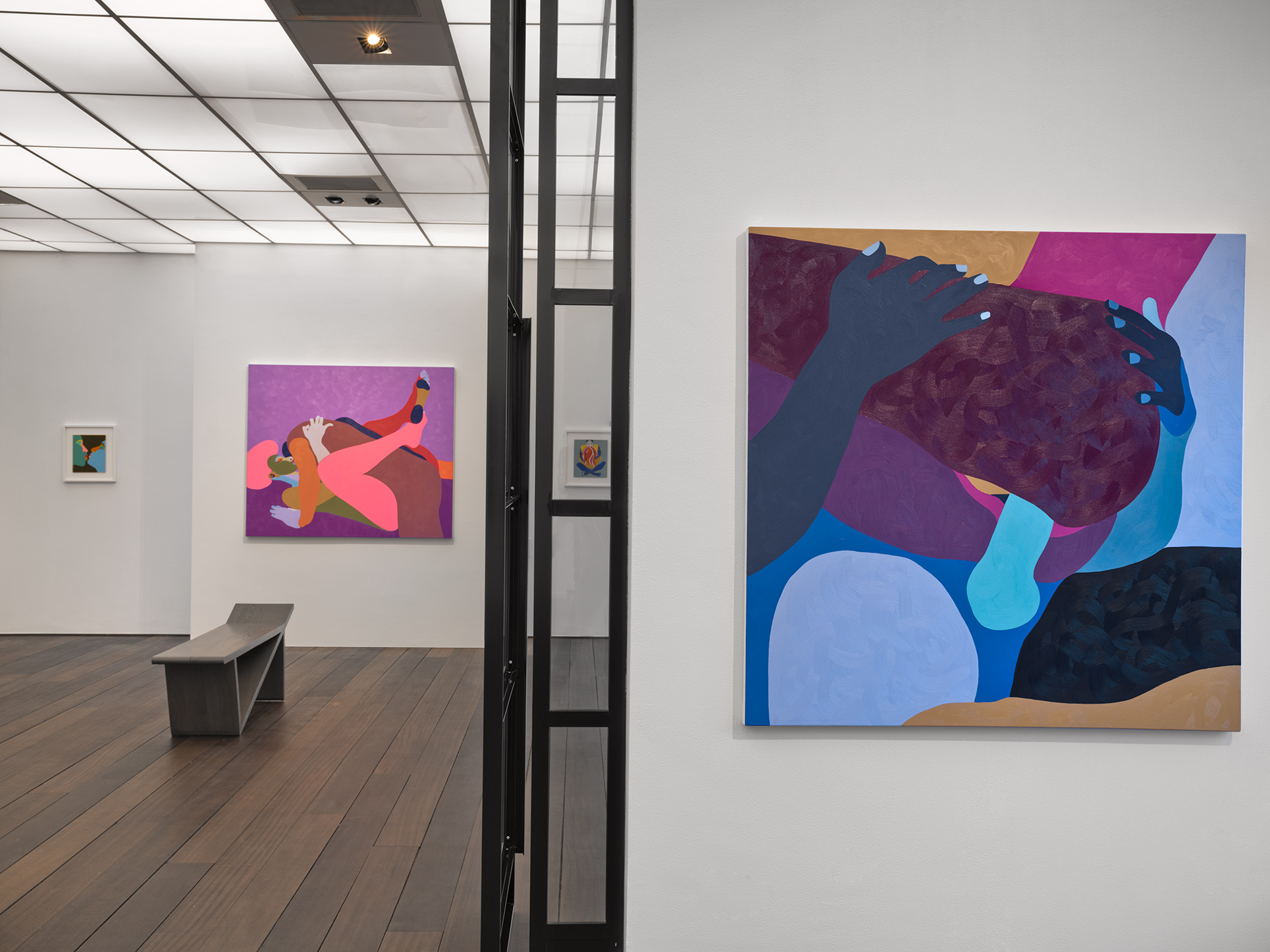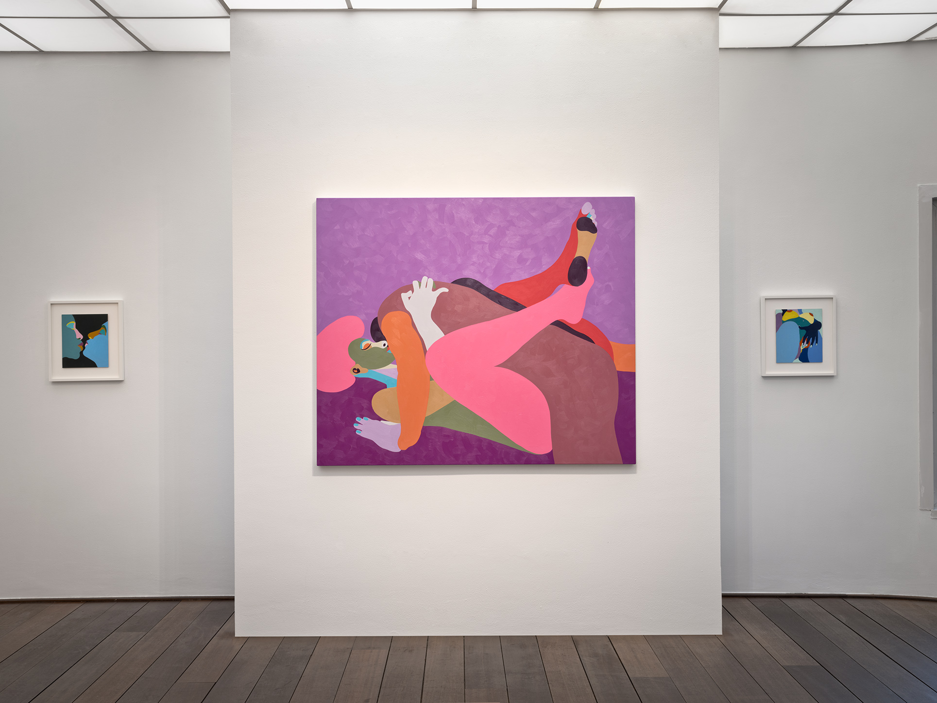 Inspired by Pablo Picasso’s blue period, the artist introduces the colour in a patchwork of tones to divide the space of the paintings. In Lipsing (2022), two profiles collide at the nose in a composition of navy and turquoise, contrasted by a bold yellow. In another work, Though Lovers Be Lost, Love Shall Not (2022) the multiple shades of blue demand the audience to stay with the work longer to comprehend the content. Though inspired by Picasso’s undeniable melancholy, Beard remains devoted to electrifying notions of yearning and desire and the beautifully orchestrated monochromatic topographies indicate a heightened sensibility in the new works.