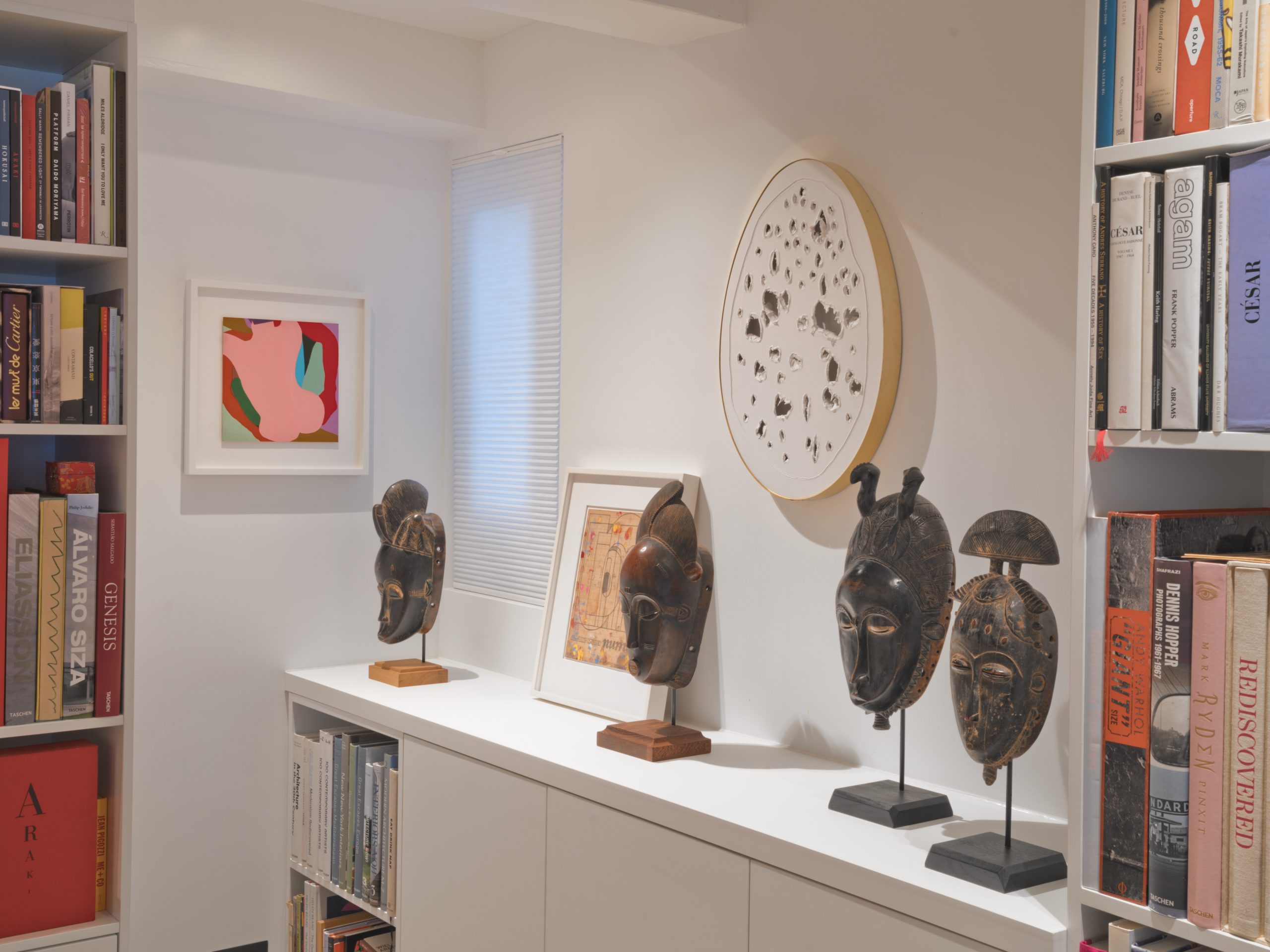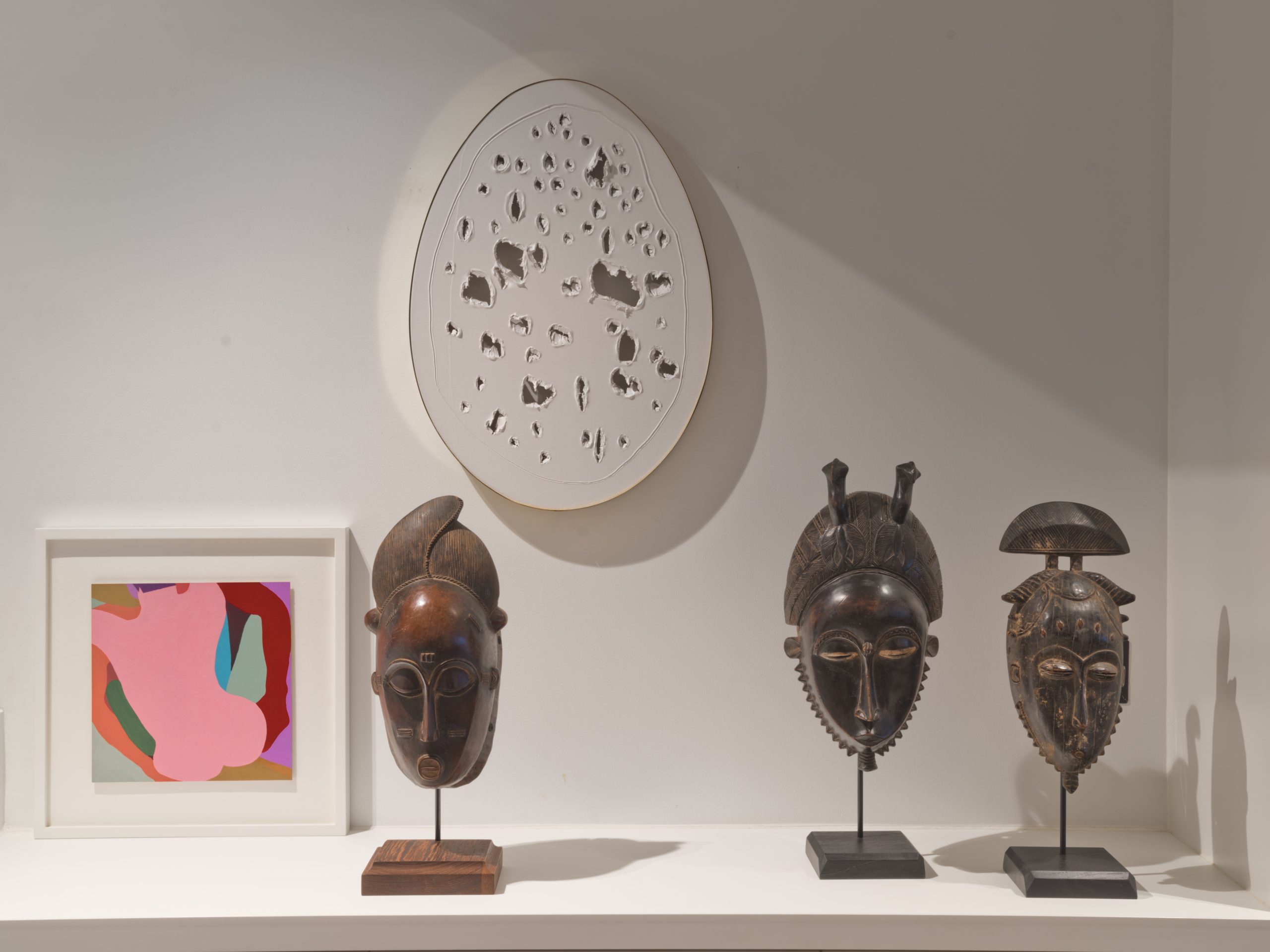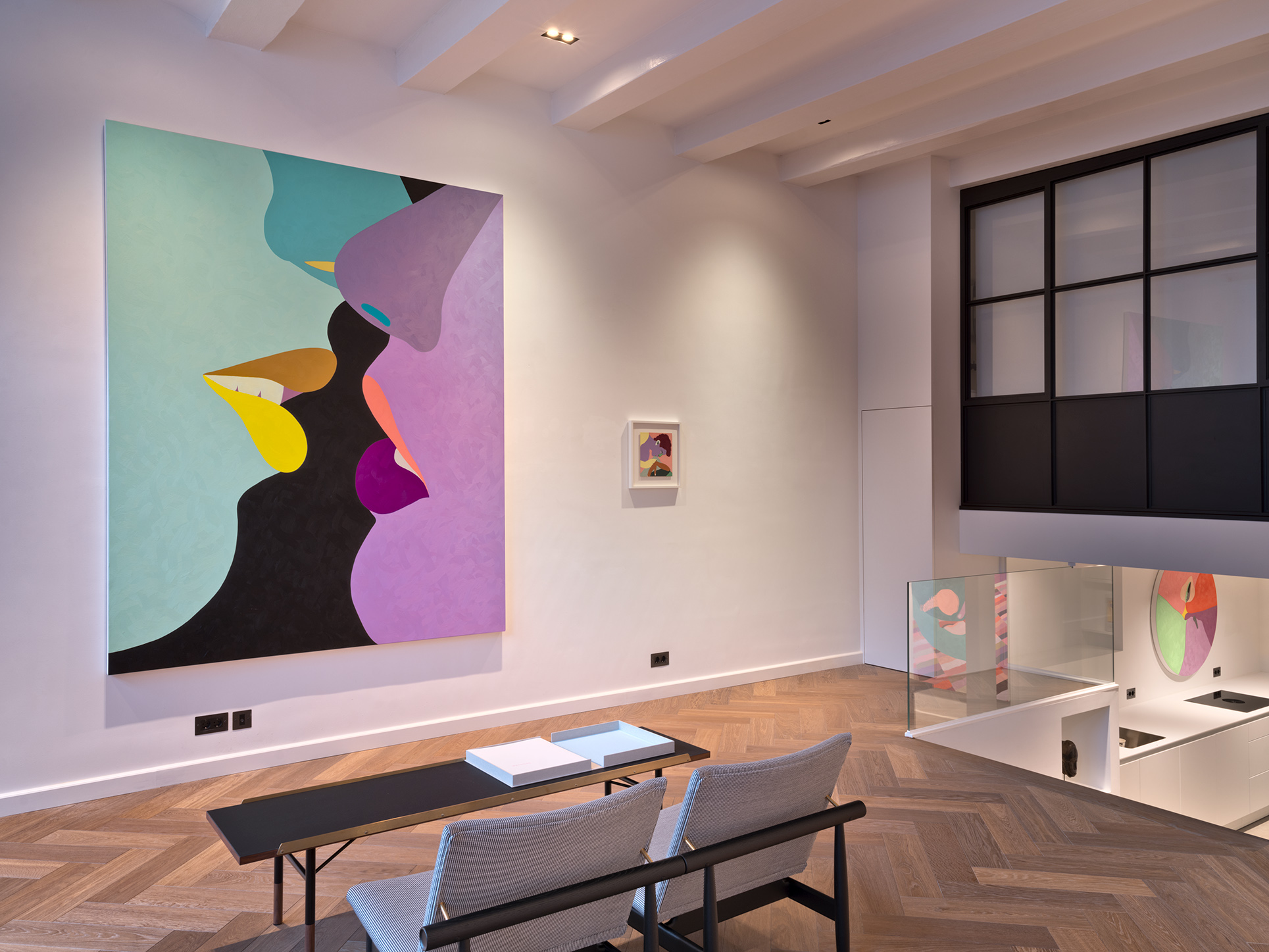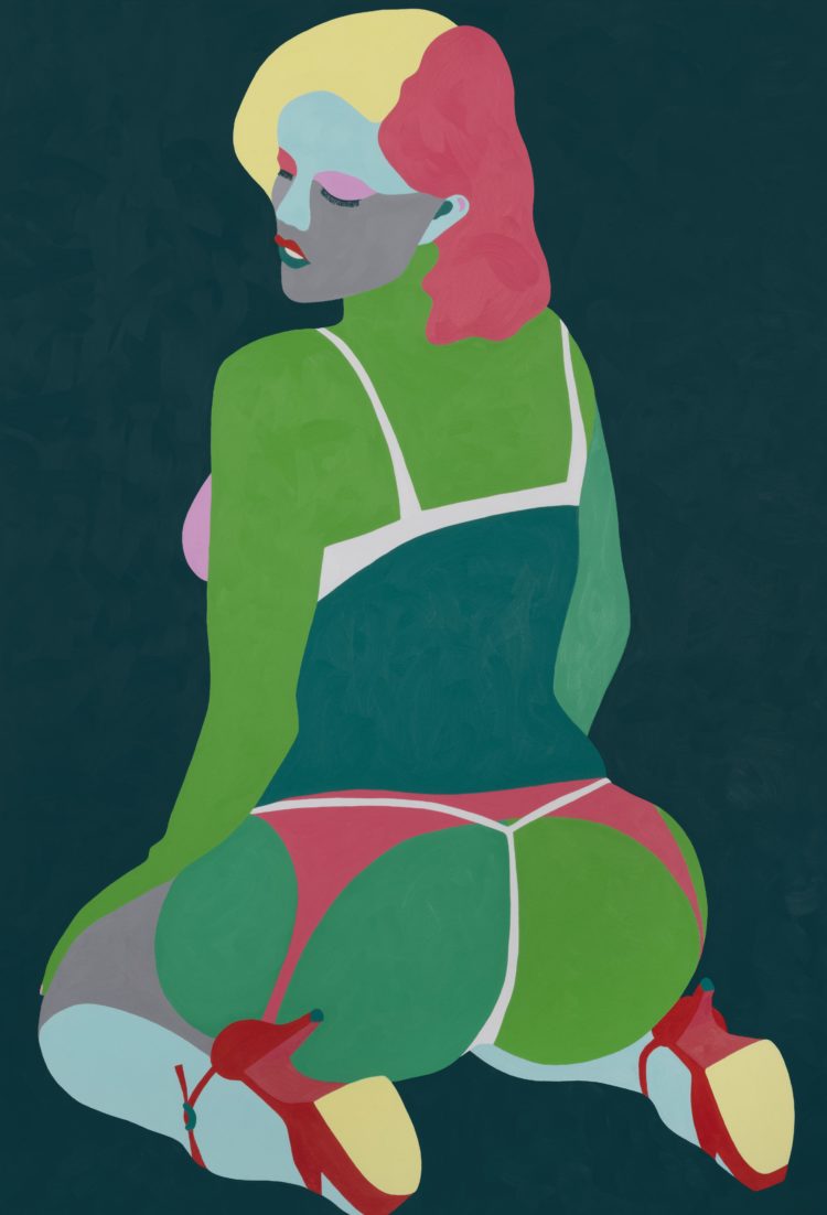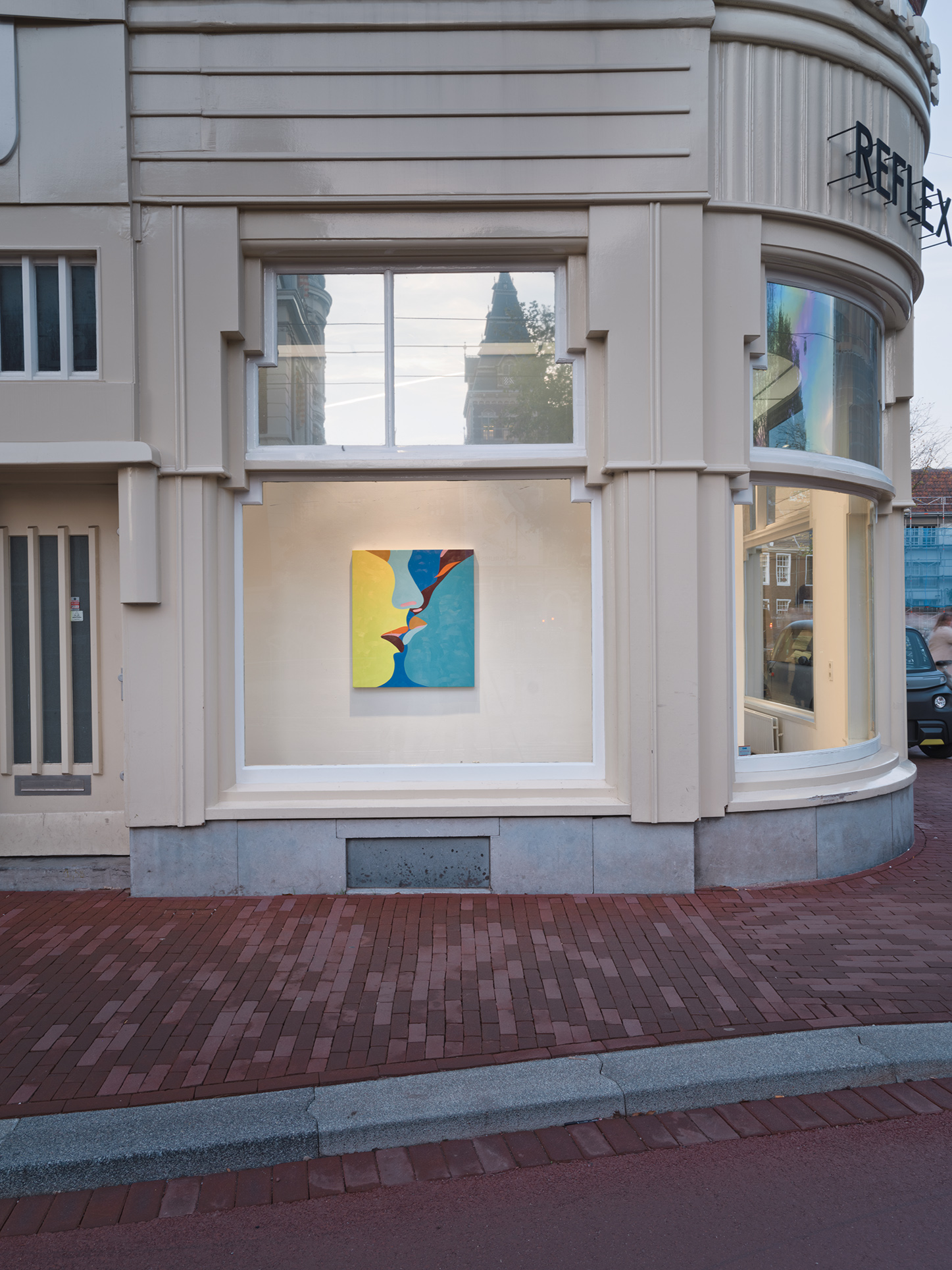 Inspired by Pablo Picasso’s blue period, the artist introduces the colour in a patchwork of tones to divide the space of the paintings. In Lipsing (2022), two profiles collide at the nose in a composition of navy and turquoise, contrasted by a bold yellow. In another work, Though Lovers Be Lost, Love Shall Not (2022) the multiple shades of blue demand the audience to stay with the work longer to comprehend the content. Though inspired by Picasso’s undeniable melancholy, Beard remains devoted to electrifying notions of yearning and desire and the beautifully orchestrated monochromatic topographies indicate a heightened sensibility in the new works.