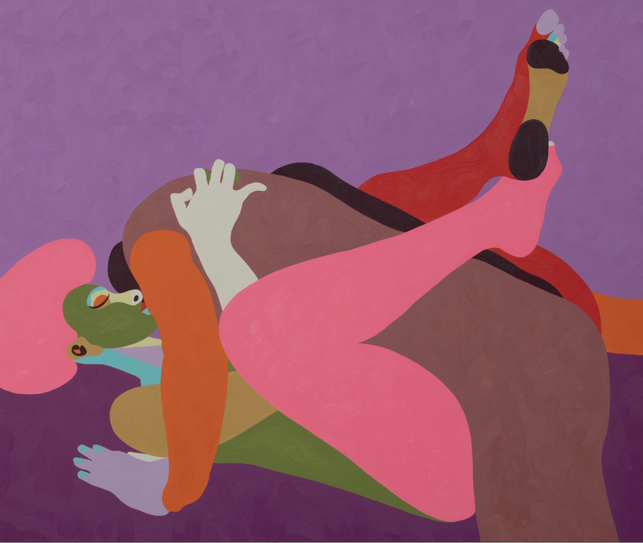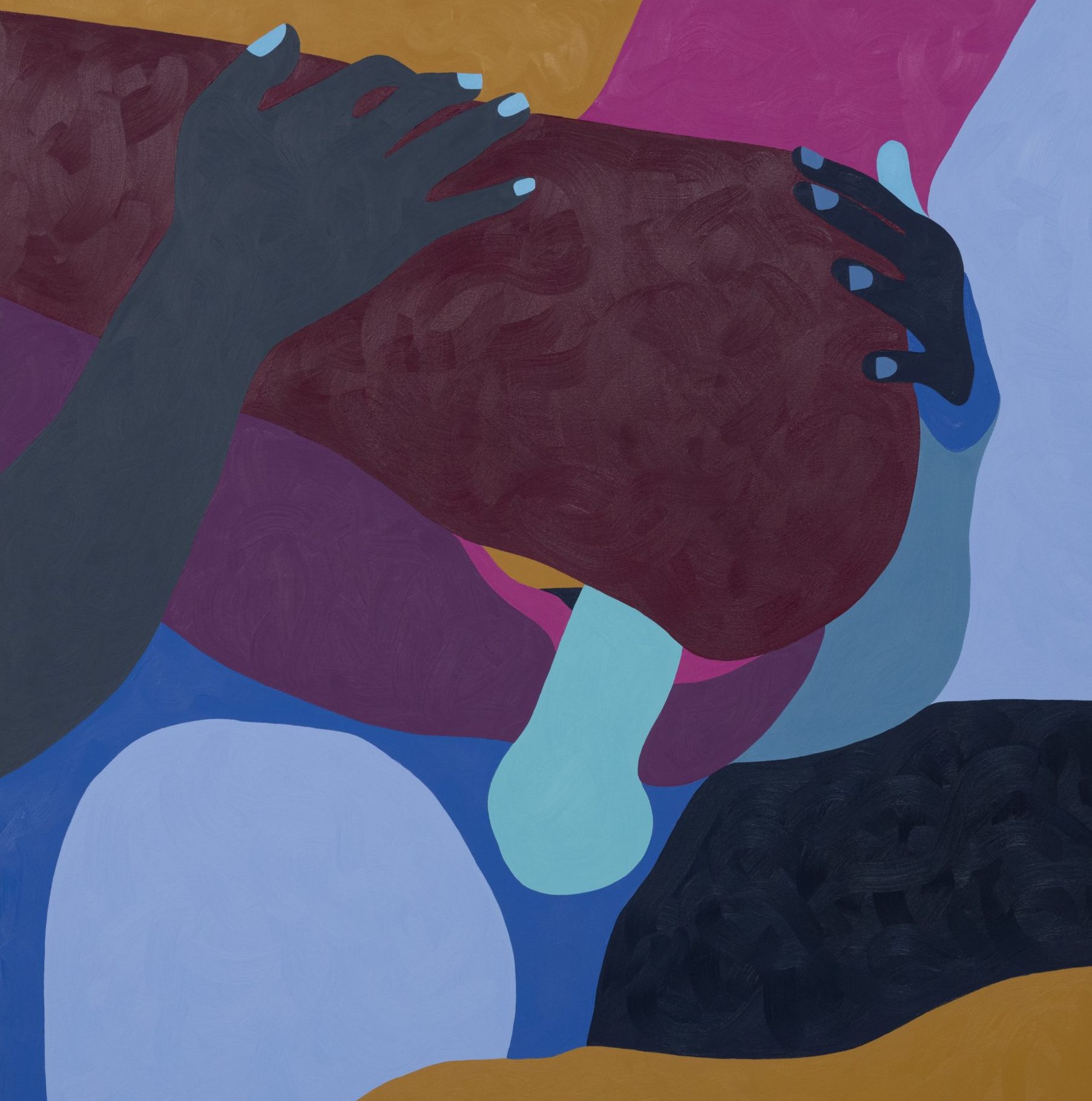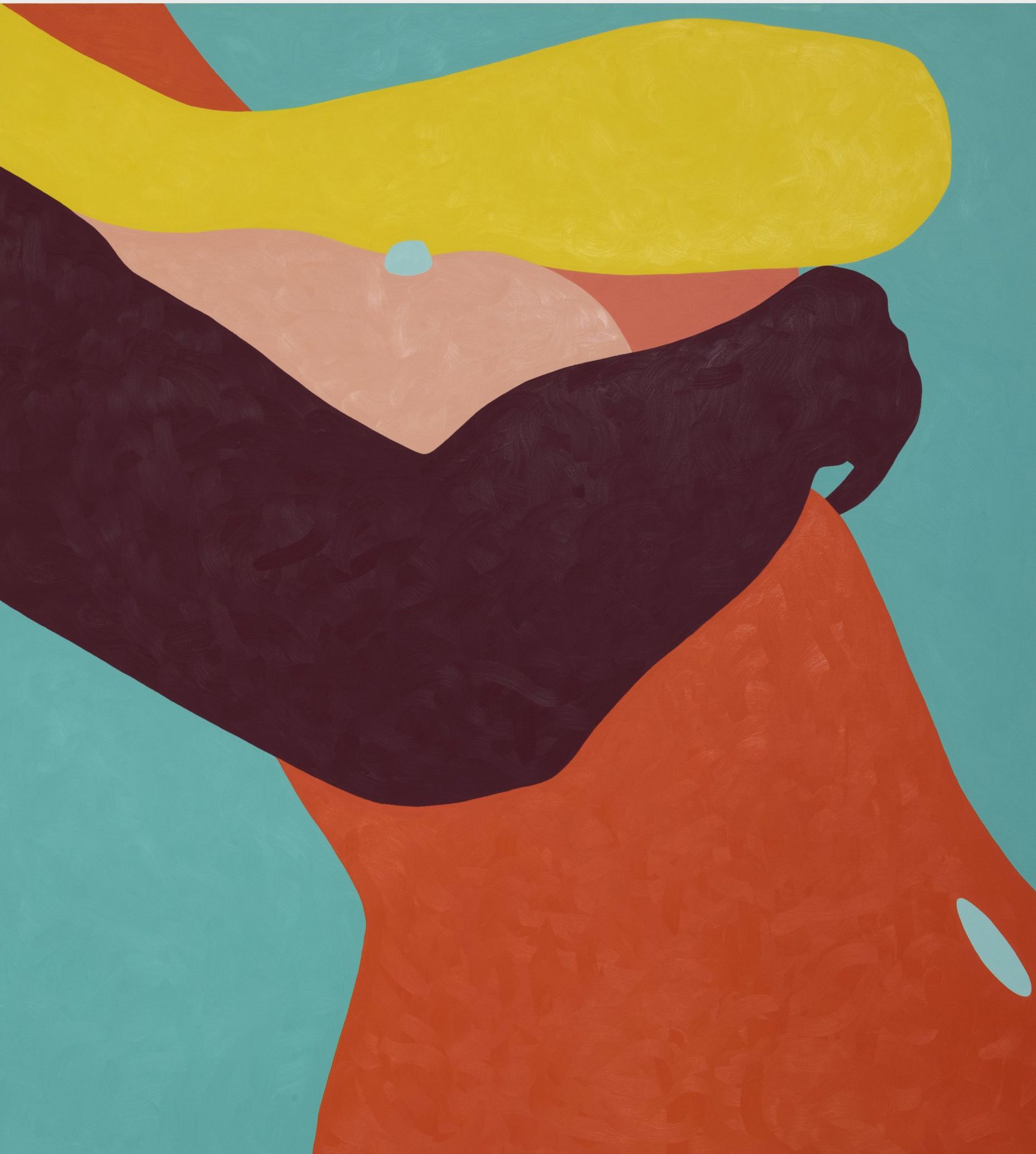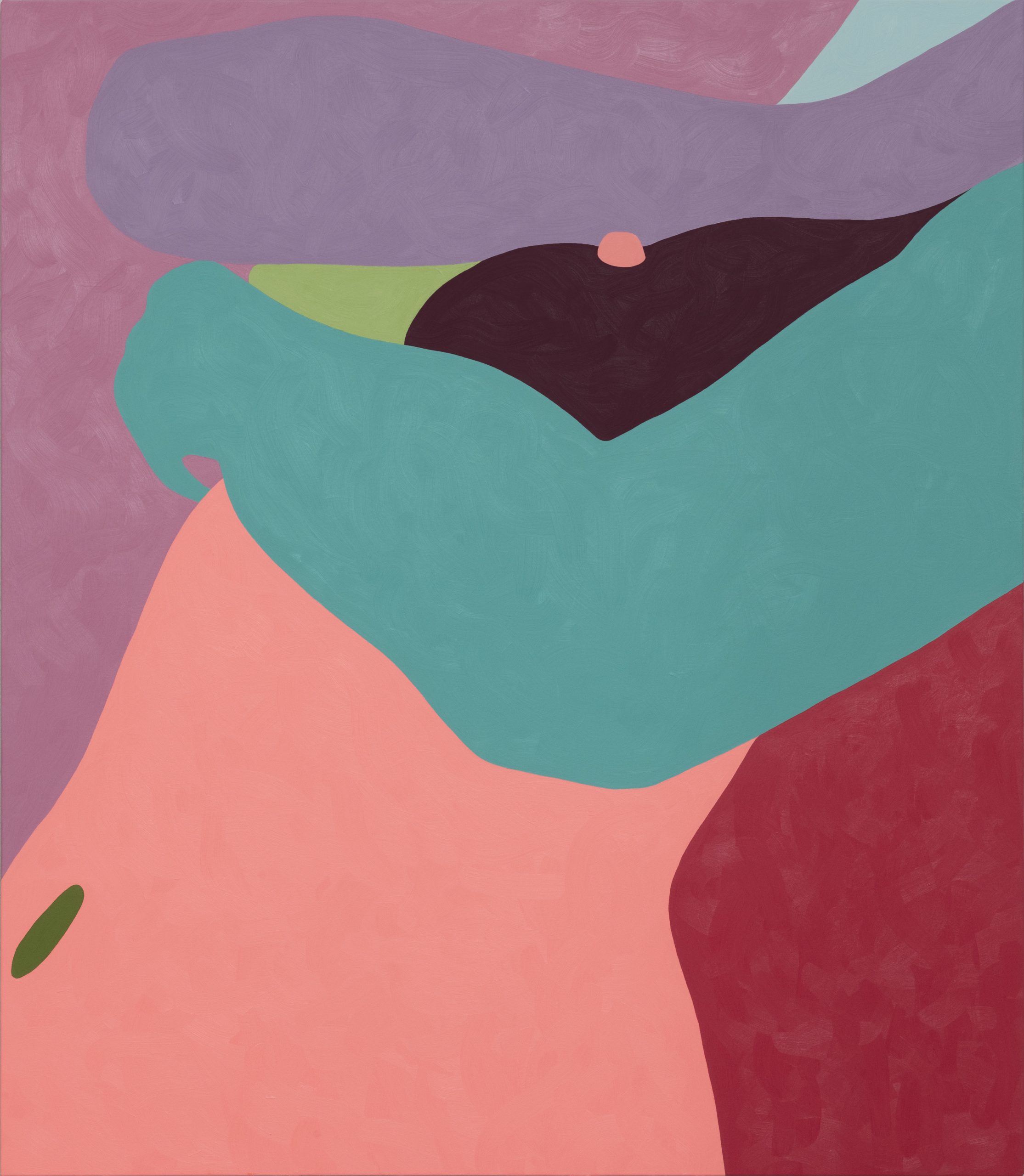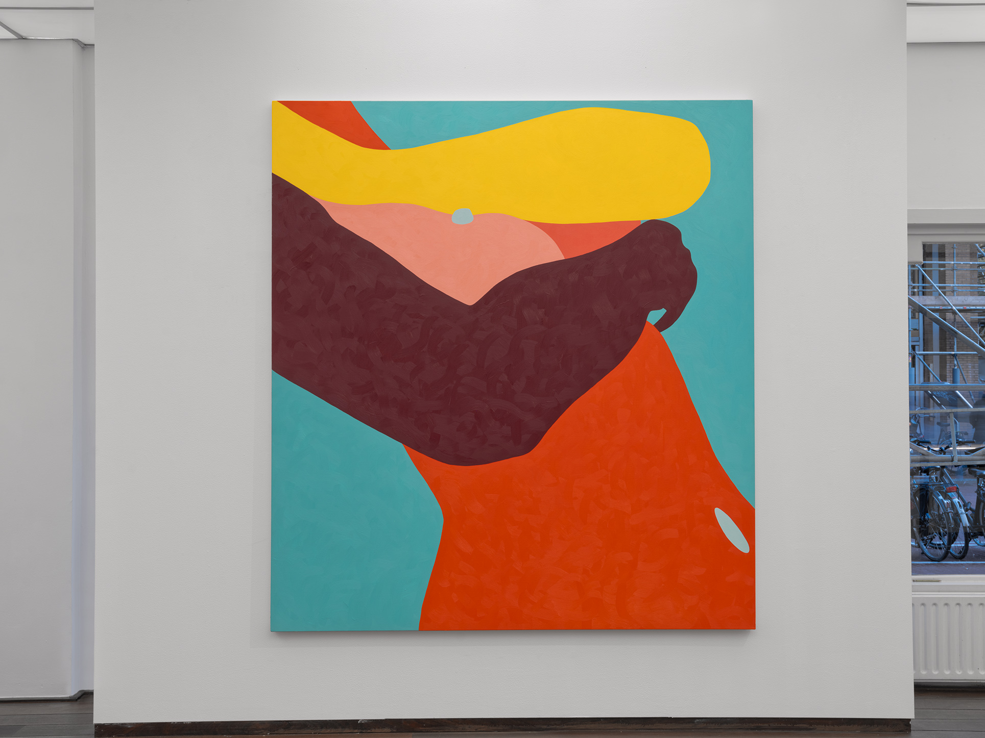Beard’s practice explores the body as a geography of touch. Lips meet lips, a torso rests on the body beneath it, hands stroke the back of a neck. Skin on skin is depicted in thick layers of oil paint applied in rhythmic strokes. The framing remains cinematic, moving elegantly from intimately detailed shots to entire mise-en-scènes of dynamic hues. In the exhibition, The Tulips are too Excitable, it is Winter Here, Beard takes her audiences on a journey where colour is an evocative tool for navigation.