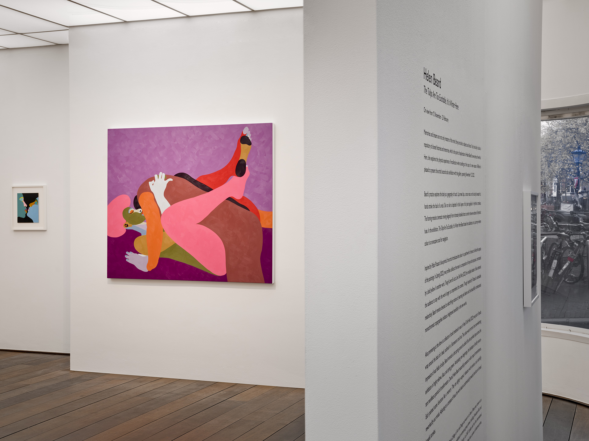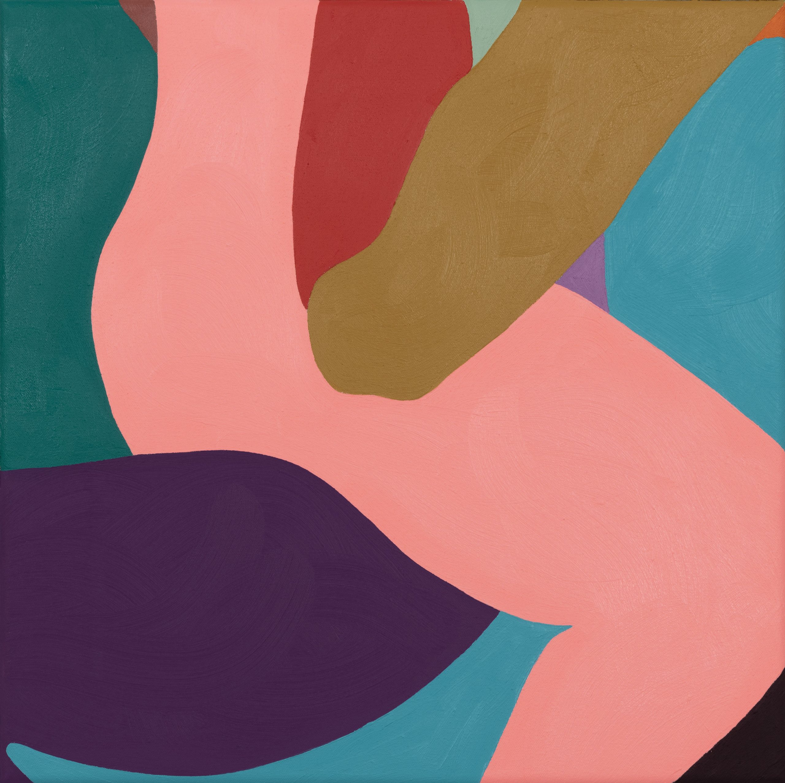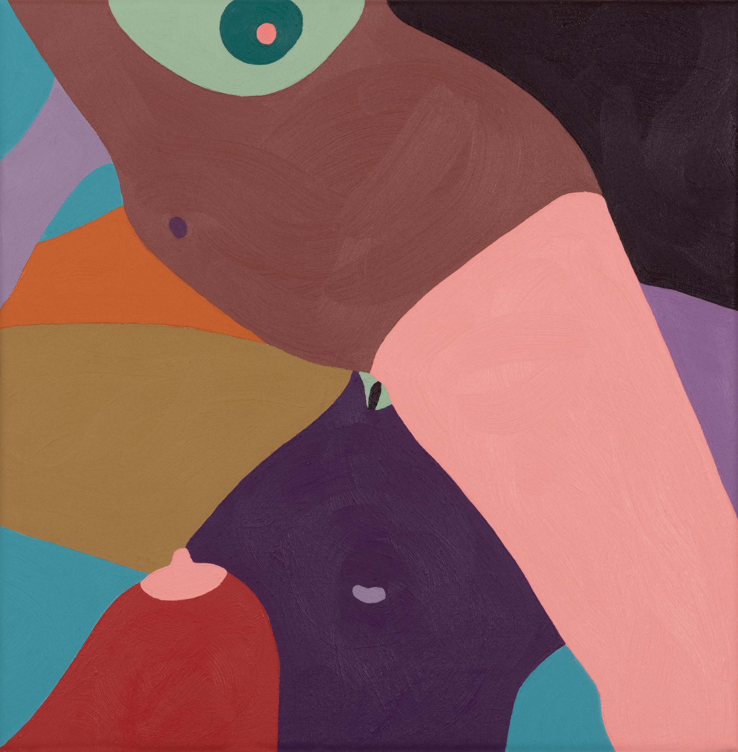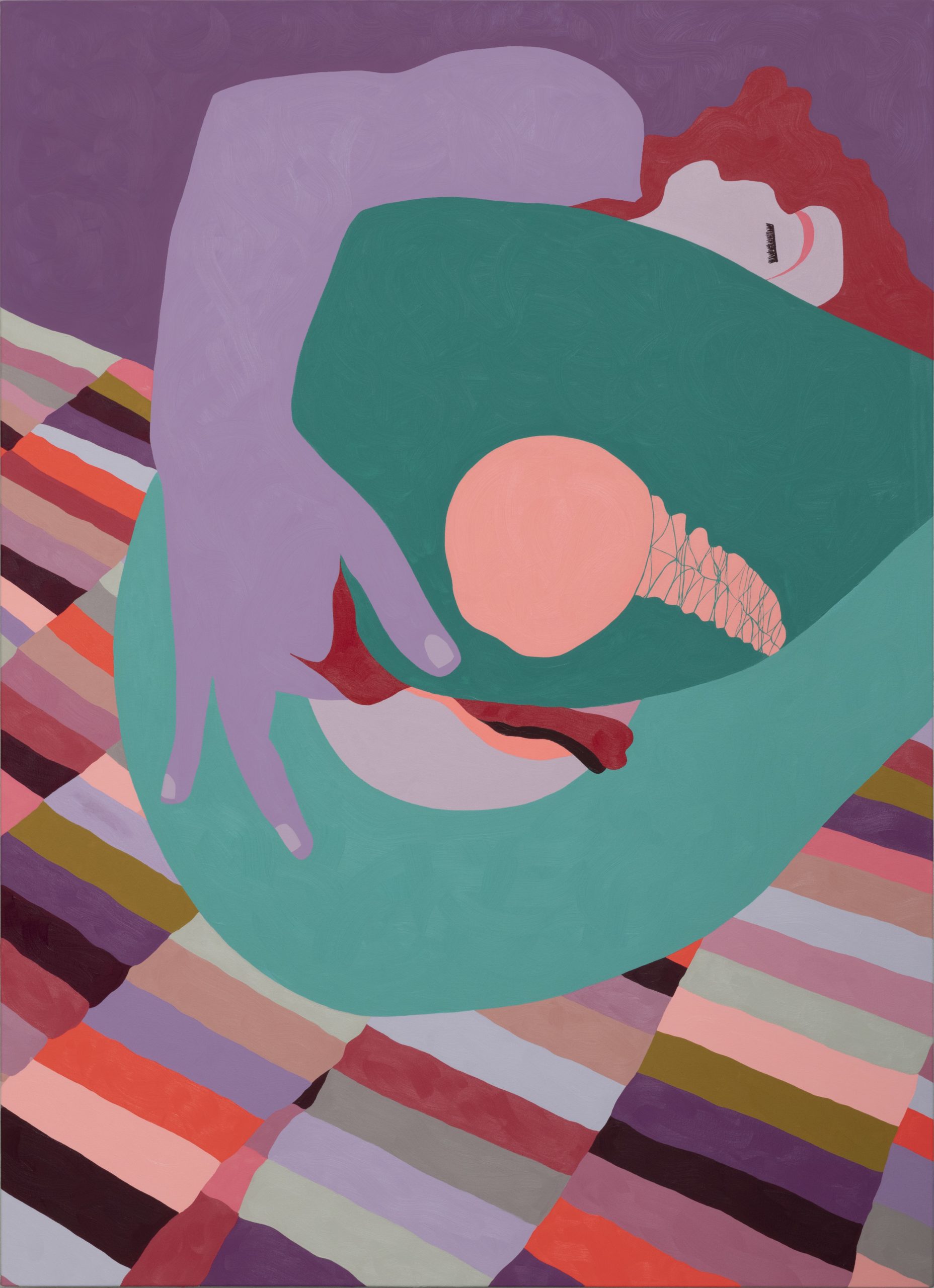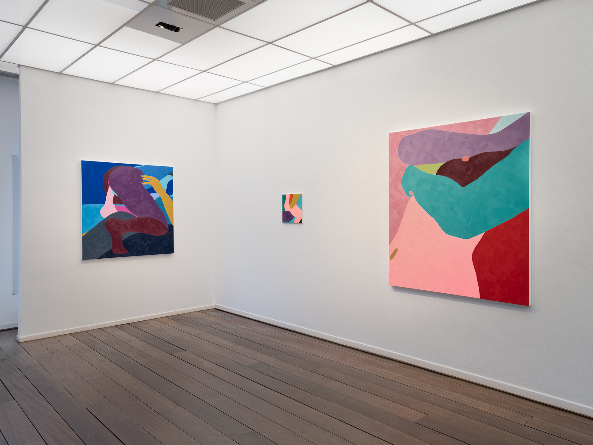 Beard’s practice explores the body as a geography of touch. Lips meet lips, a torso rests on the body beneath it, hands stroke the back of a neck. Skin on skin is depicted in thick layers of oil paint applied in rhythmic strokes. The framing remains cinematic, moving elegantly from intimately detailed shots to entire mise-en-scènes of dynamic hues. In the exhibition, The Tulips are too Excitable, it is Winter Here, Beard takes her audiences on a journey where colour is an evocative tool for navigation.