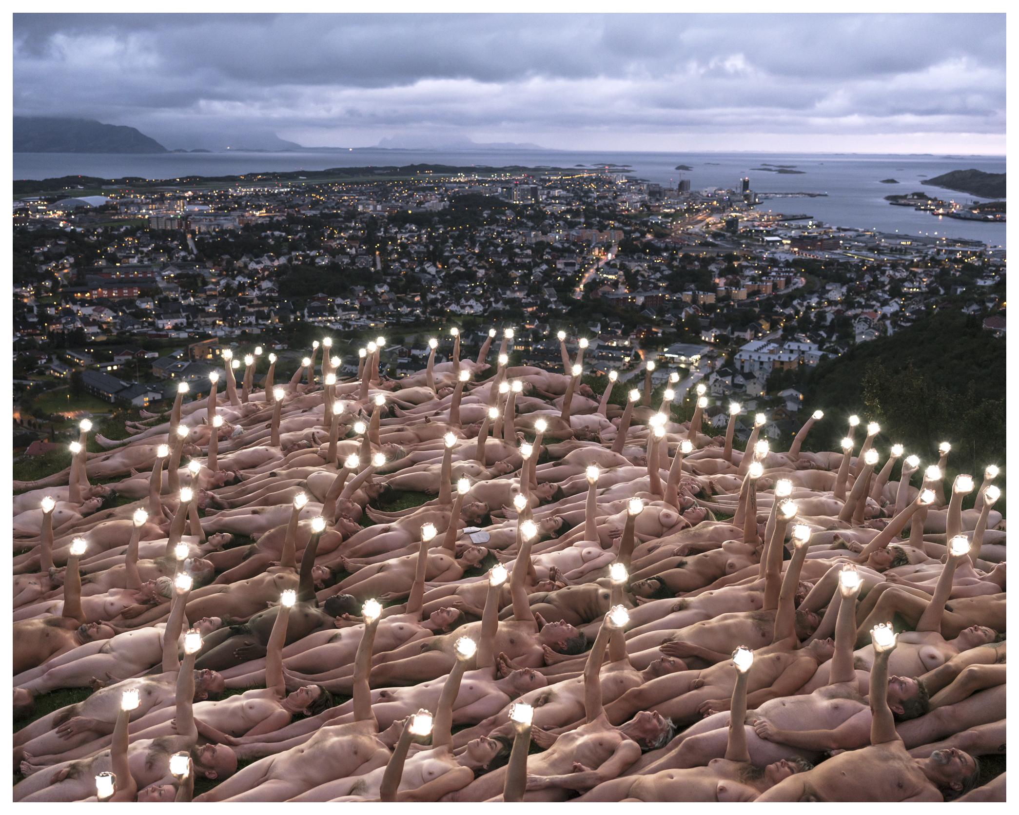 The masses of bodies – what the artist calls “the body in multiple” – is an undeniably captivating feature of Tunick’s practice. Bodo Bodyscape is an ode to this phenomenon, as human bodies are folded over a hillside overlooking a small Norwegian city at the break of dawn. Each person is holding a solar light in their out-stretched arms, mirroring the city lights