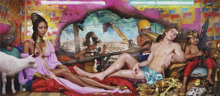 For this tableau, LaChapelle referenced Sandro Botticelli’s painting Venus and Mars (1485) to comment on the exploitation of the African continent. In particular, he had seen National Geographic’s 2009 exposé on the unconscionable effects of the gold trade, and reinterpreted Venus and Marsto tell the story. “It’s a postcoital scene: Mars, god of war, is sleeping on all his spoils, while Venus, goddess of love, is looking unsatisfied,” he toldThe Guardian in 2014. “Things haven’t changed much, I thought. Greed and war versus love and beauty.”Elements from Botticelli’s work took on new forms in LaChapelle’s: Satyrs turned into child soldiers, mines were added to the backdrop, and Venus represents Africa, her dress ripped to denote rape. And, as Botticelli used a well-known beauty to sit for his Venus, LaChapelle wanted to do the same, working again with Naomi Campbell.Ultimately, LaChapelle wanted the image to critique consumerism, greed, and power. “I made it right after the financial collapse [of 2007–08], when we were being advised to invest in gold and gold production spiked tenfold,” LaChapelle said. “The irony is that by putting your money into a safer security like gold, you are ensuring more devastation, more climate change, more destruction.”
