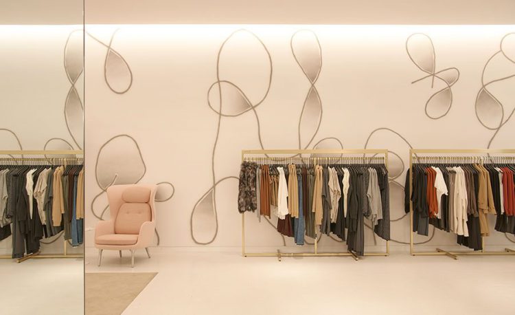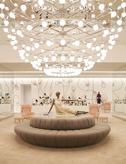 London-based artist Barry Reigate was commissioned to create a 220-foot-long by 12-foot-high mural running the full length of the shoes and sunglasses departments of the new building of Saks Fifth Avenue. The graphic design is composed of interconnecting freestyle lines that play off the clean, crisp lines of the overall store design.