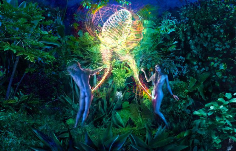 It follows that someone like LaChapelle, given to extremes, would want to give us his vision of paradise. He's embraced his spirit of excess down to the finest detail, creating a burlesque pastoral that feels, as it sinks in, disarmingly sincere. ?Behold a New World? depicts three saintly figures around a tent of pink silk, their hands clasped in prayer, a waterfall pouring behind them. ?Forever? looks on as four ebullient travelers sail in a gondola of blossoms and palm leaves, one of them in an enormous feathered headdress. All of this is garishly New Age, but, as an antidote to the many poisons of ?Lost + Found,? it works. LaChapelle has made no secret of his faith, and ?Good News,? with one foot in Christendom and the other in pagan myth, aims at purity without lapsing into self-seriousness.